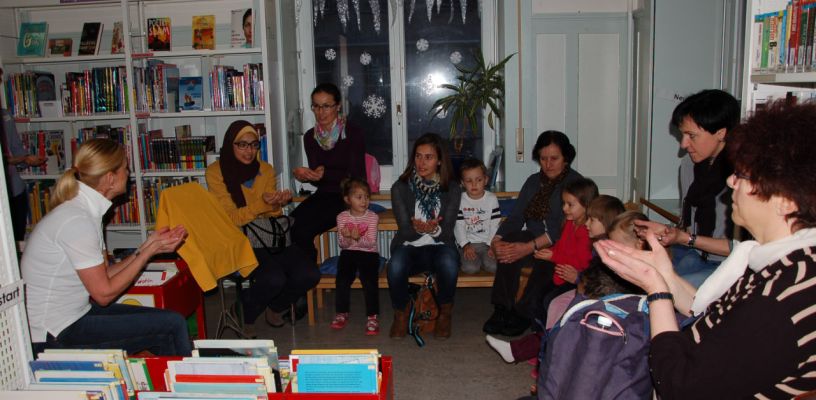 Während Kinder in eine Geschichtenwelt eintauchen, lernen Eltern und Grosseltern verschiedene Möglichkeiten der Leseförderung sowie die Angebote der Bibliothek kennen.