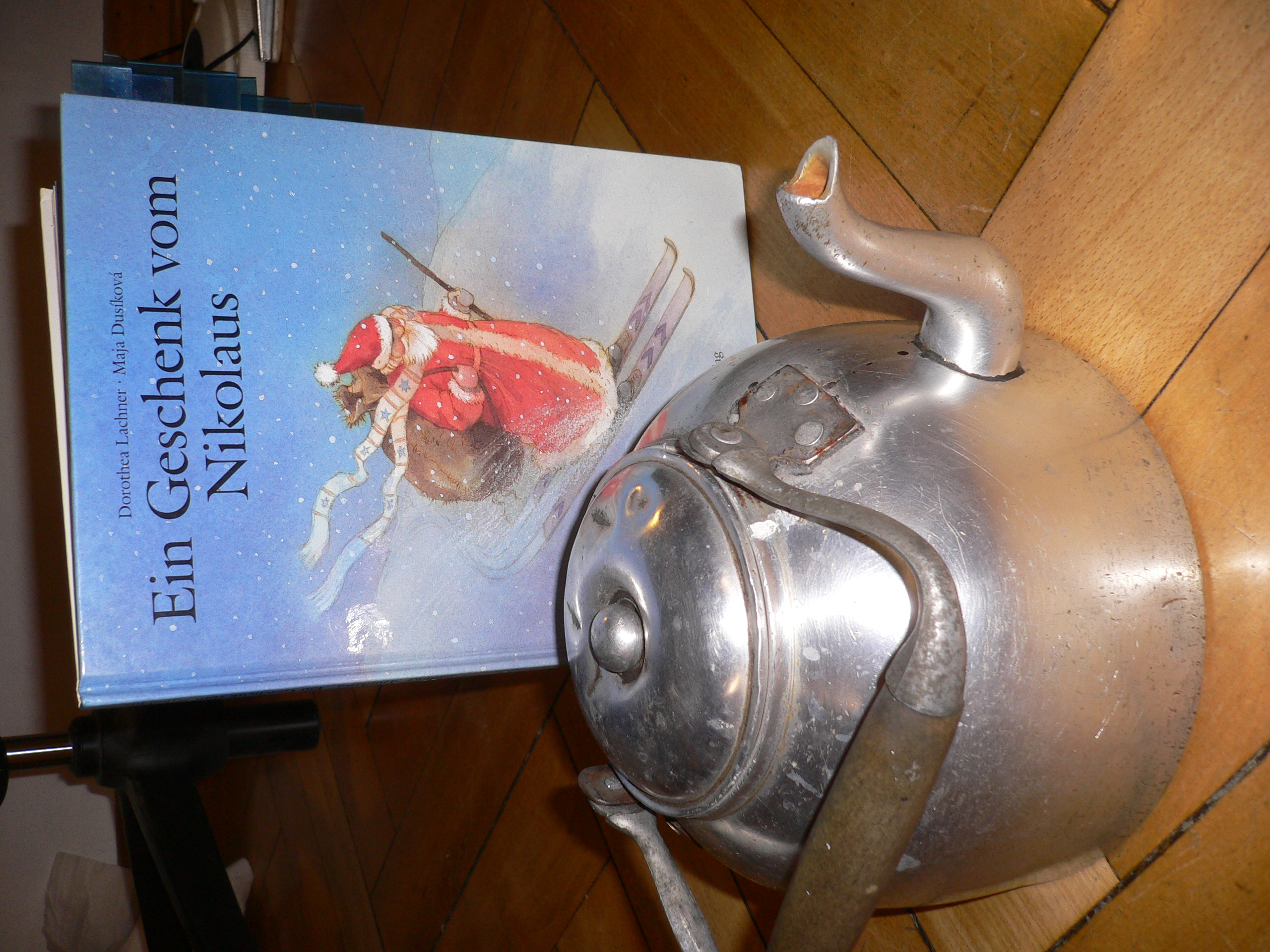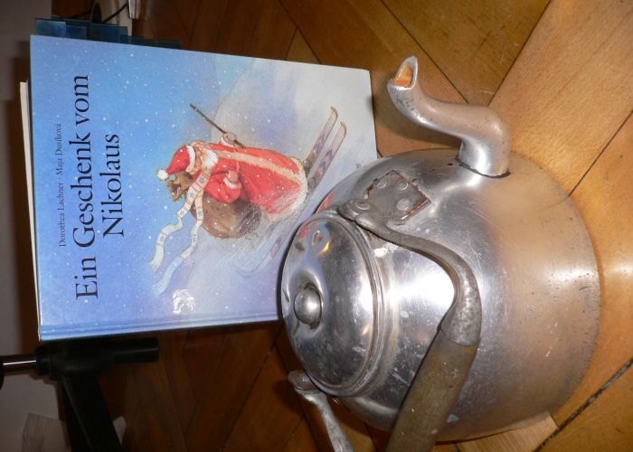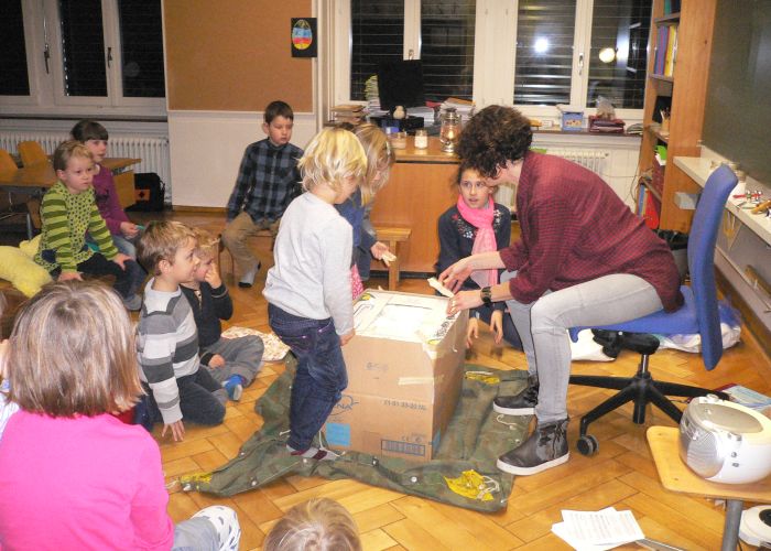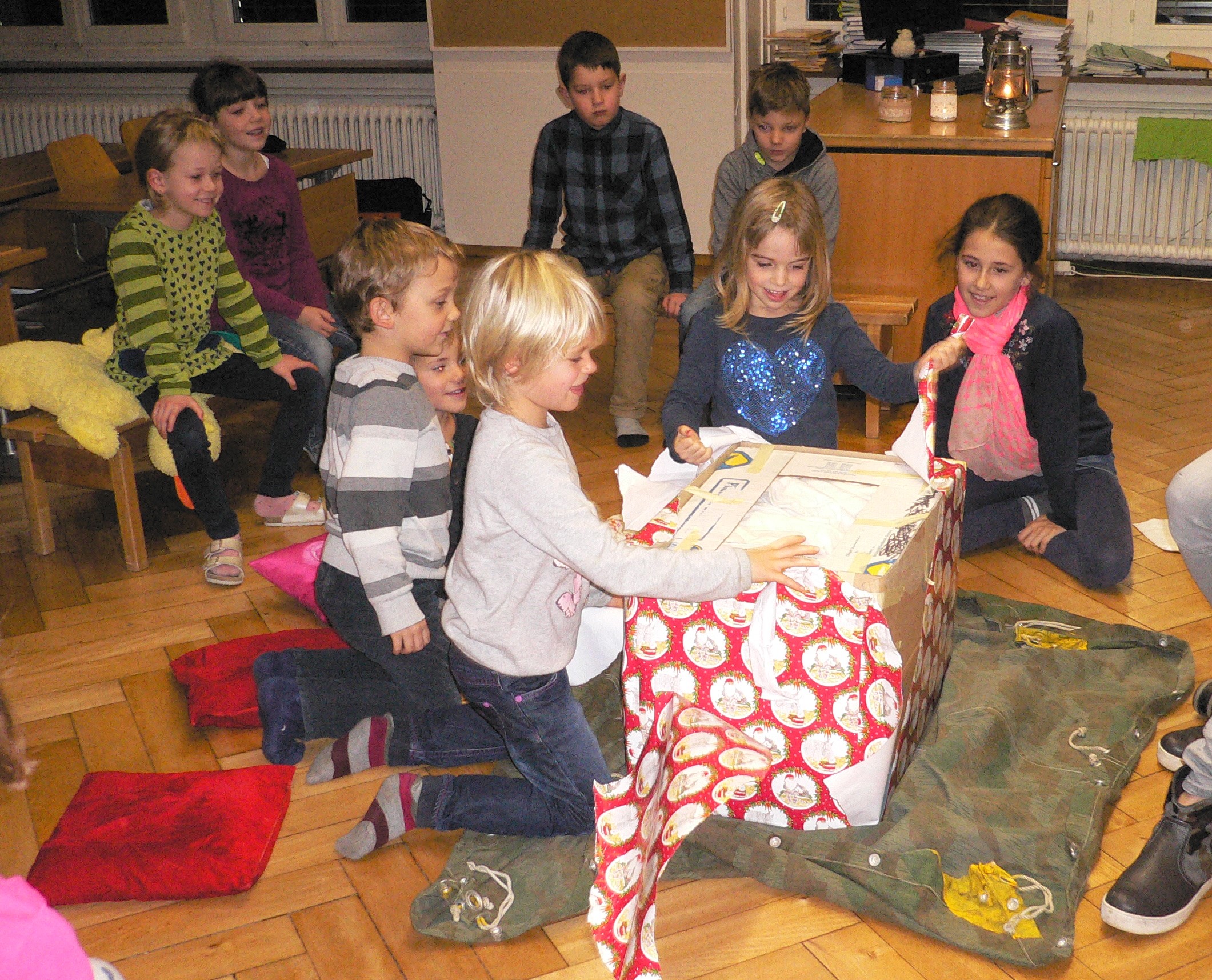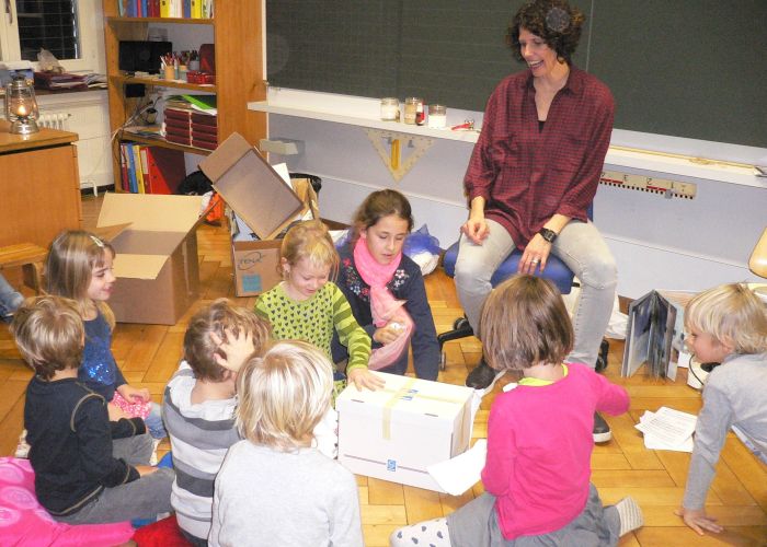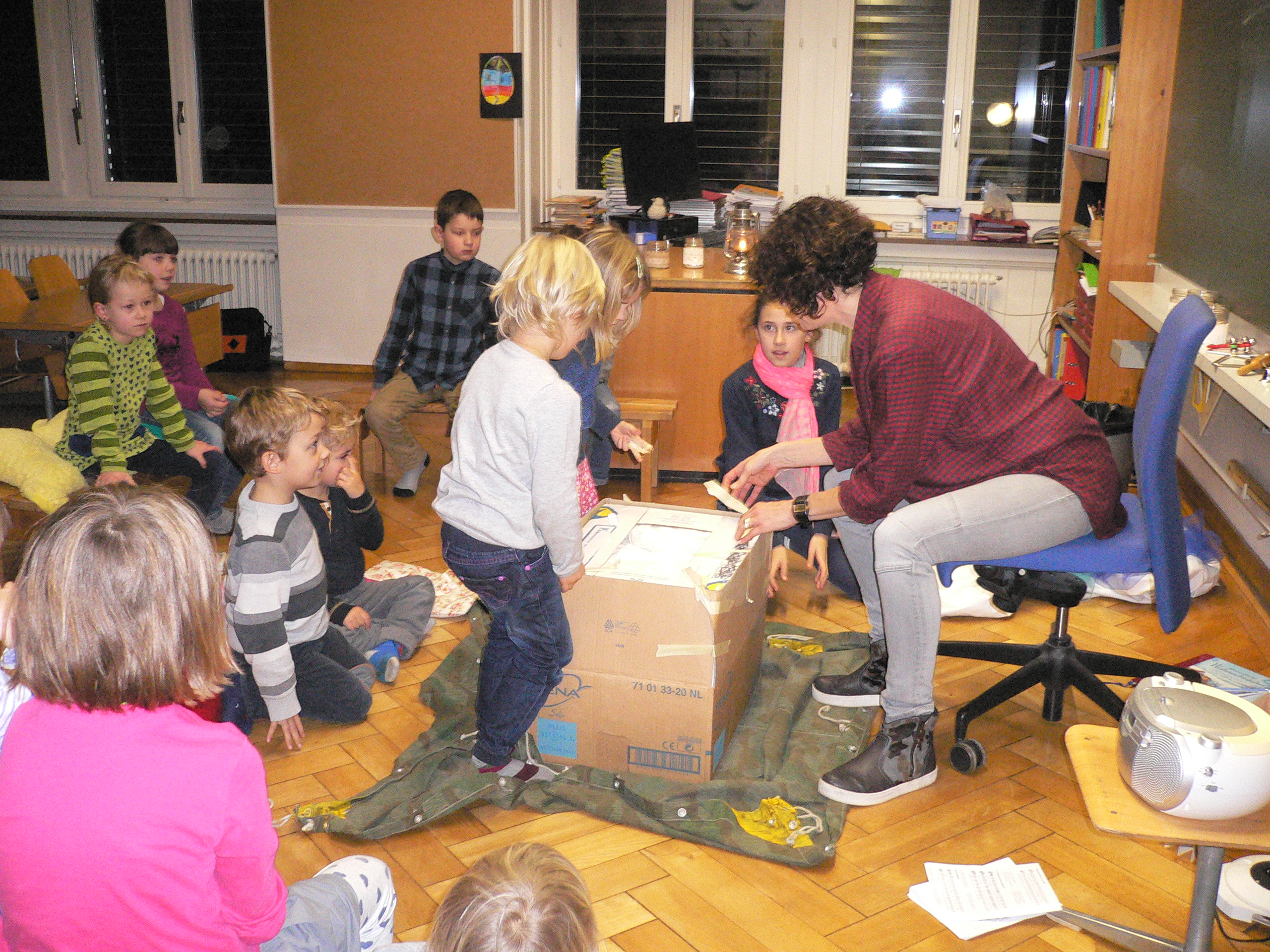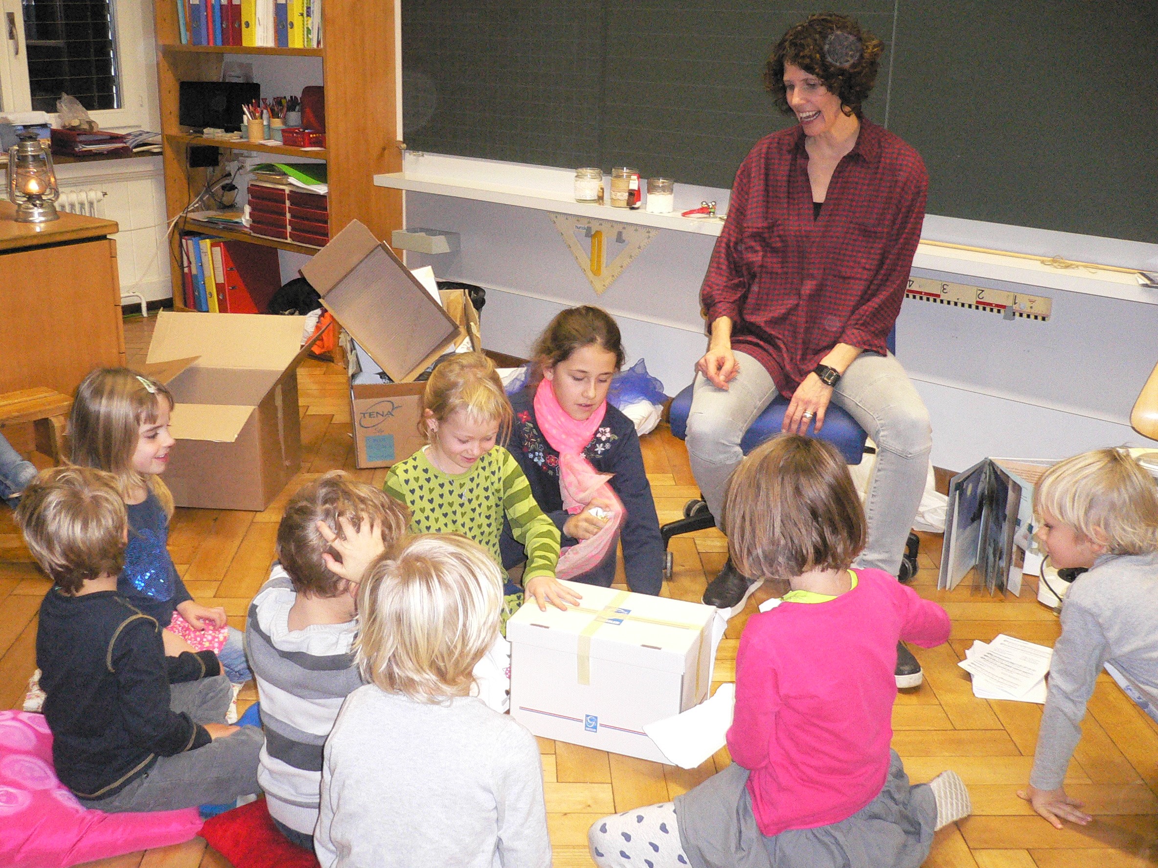 Mit grosser Freude halfen die Kinder Frau Gabathuler die Kartons auszupacken und waren verwundert, wie die Kinder im Bilderbuch, als ein alter Teekessel hervorkam. So wie die beschenkten Dorfbewohner, die sich nun wieder treffen konnten und miteinander Tee und andere Leckereien teilten, freuten sich dann auch die aufmerksamen Zuhörerinnen und Zuhörer, einen Punsch zu trinken, Mandarinen und Nüssli zu naschen.