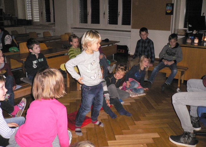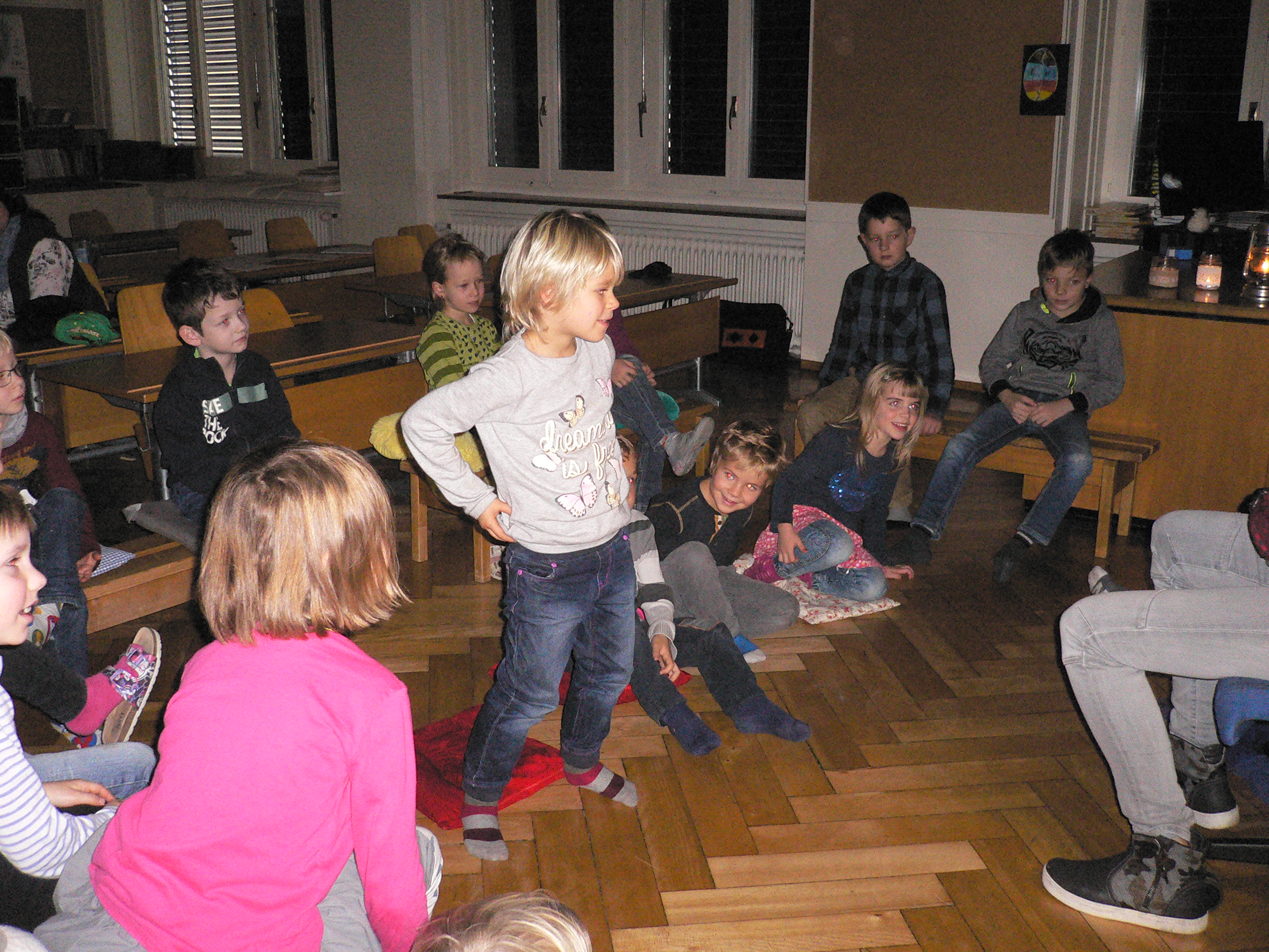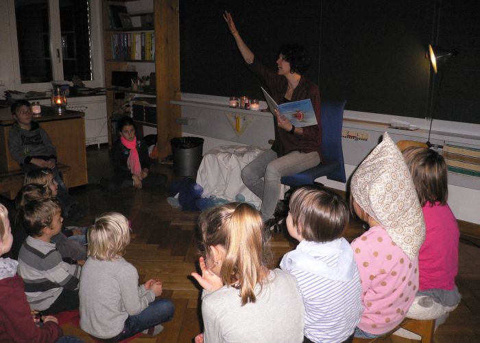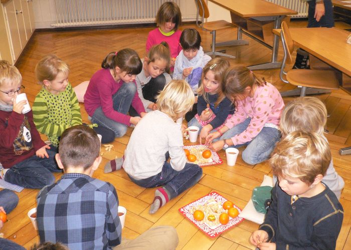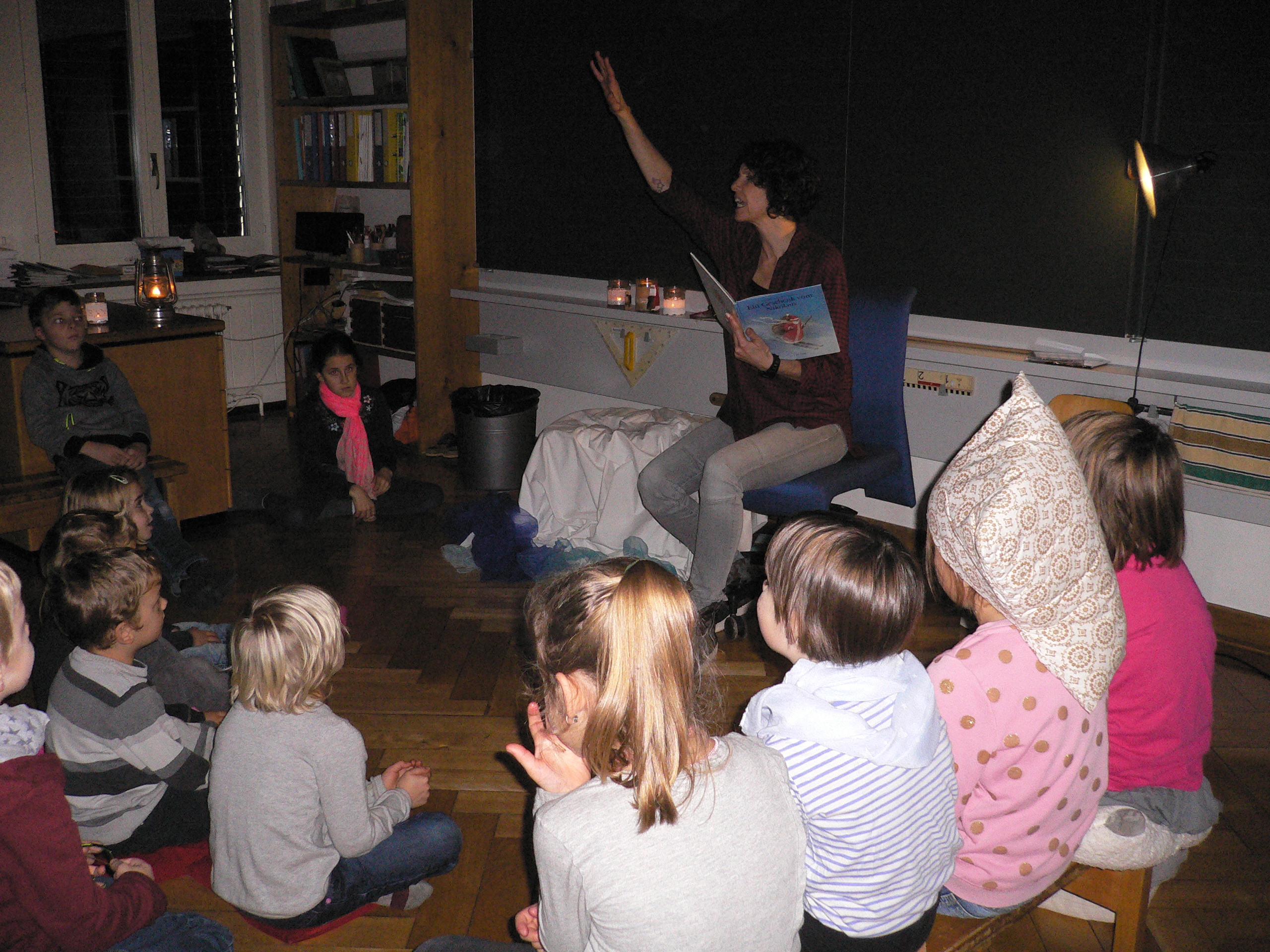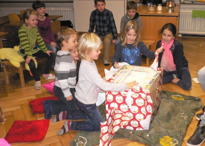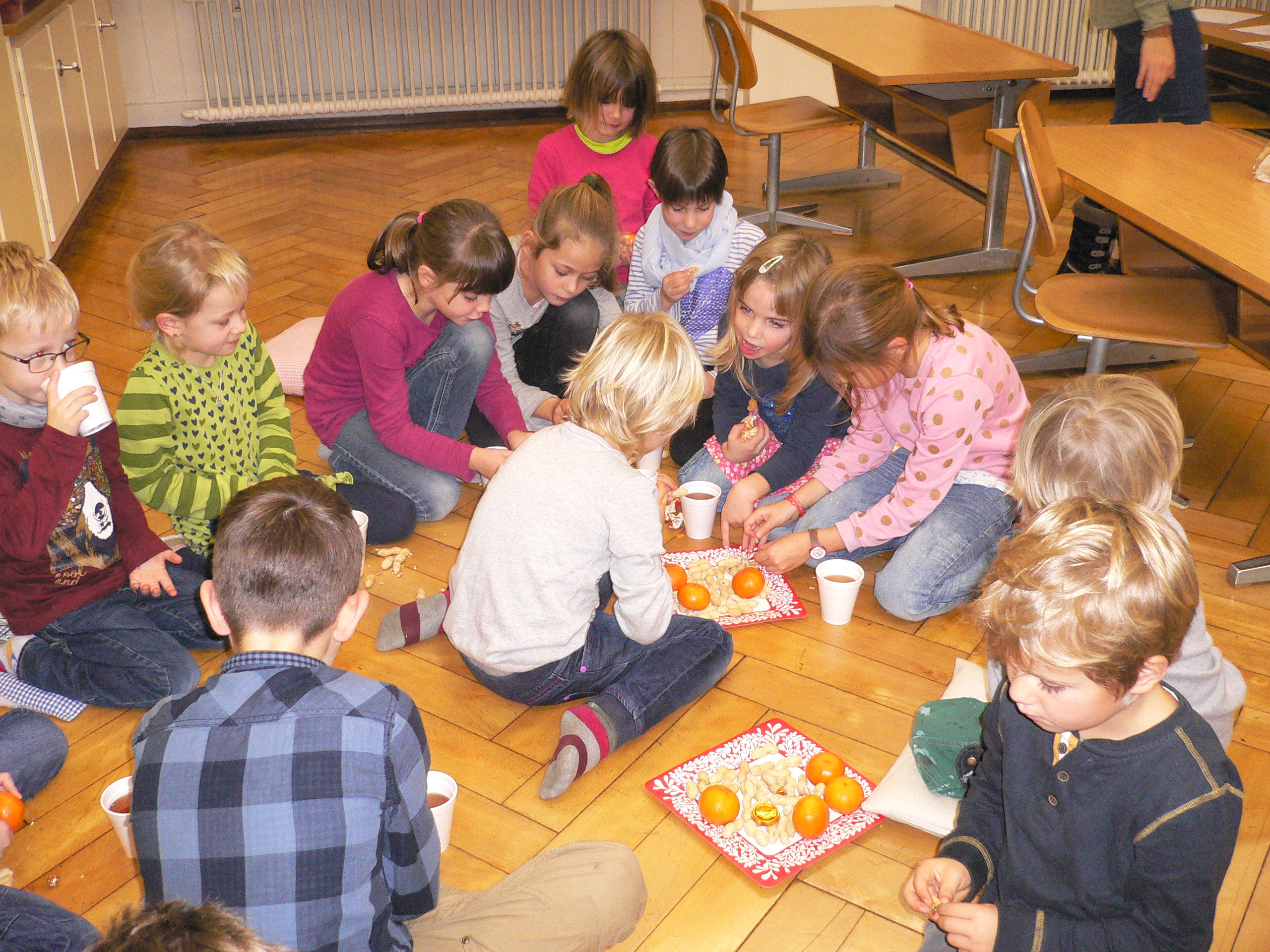 Mit grosser Freude halfen die Kinder Frau Gabathuler die Kartons auszupacken und waren verwundert, wie die Kinder im Bilderbuch, als ein alter Teekessel hervorkam. So wie die beschenkten Dorfbewohner, die sich nun wieder treffen konnten und miteinander Tee und andere Leckereien teilten, freuten sich dann auch die aufmerksamen Zuhörerinnen und Zuhörer, einen Punsch zu trinken, Mandarinen und Nüssli zu naschen.