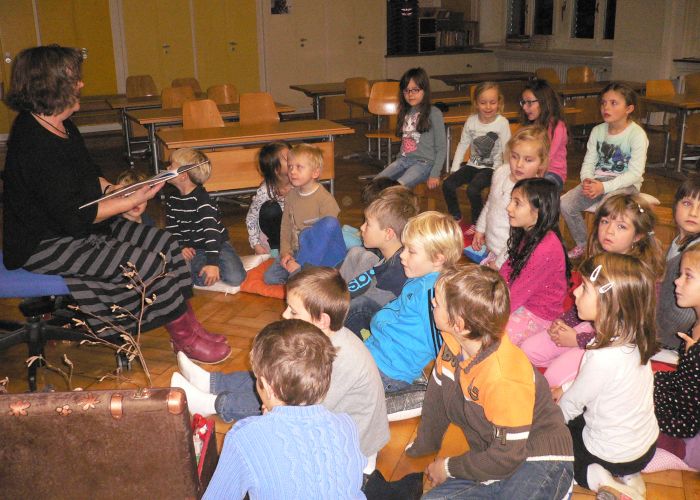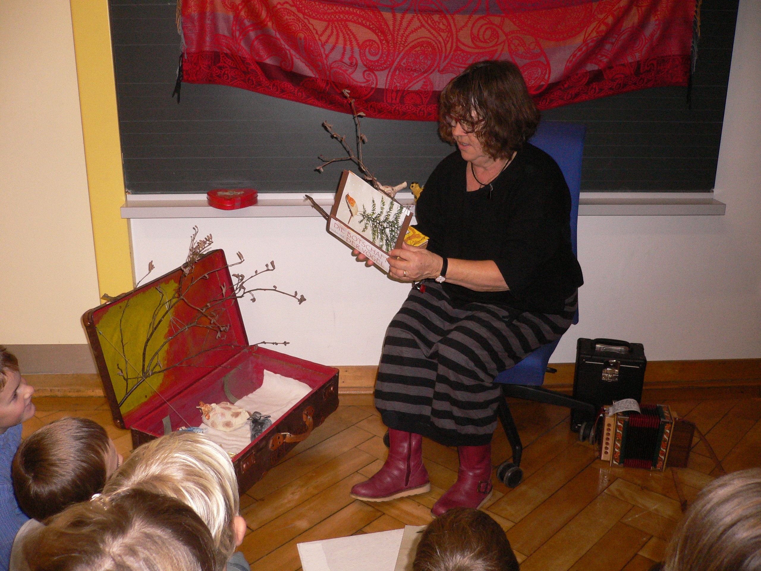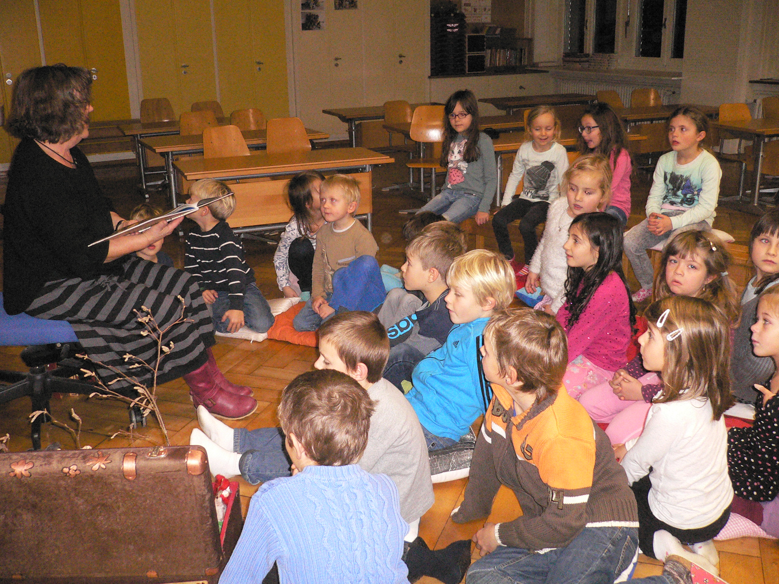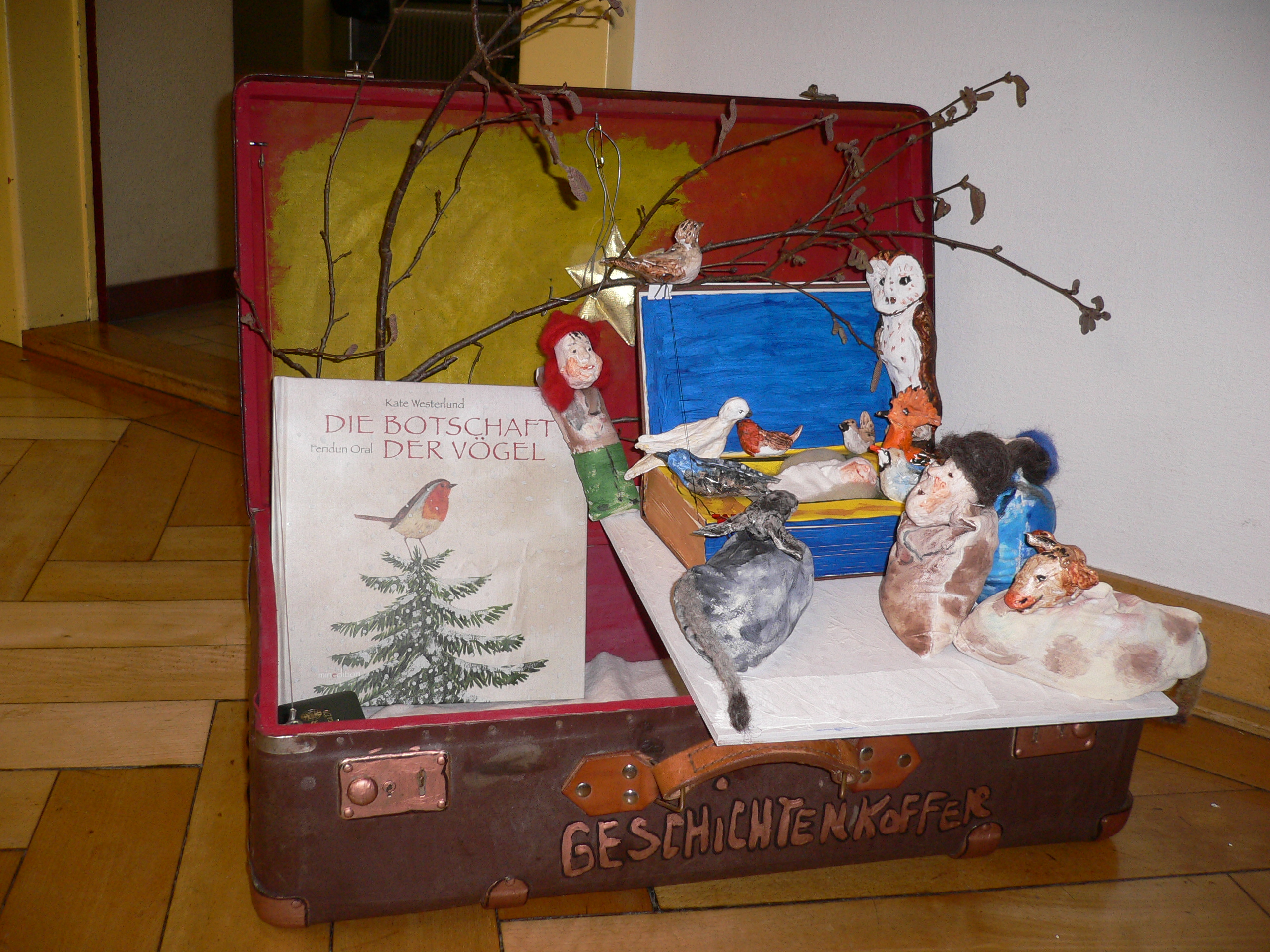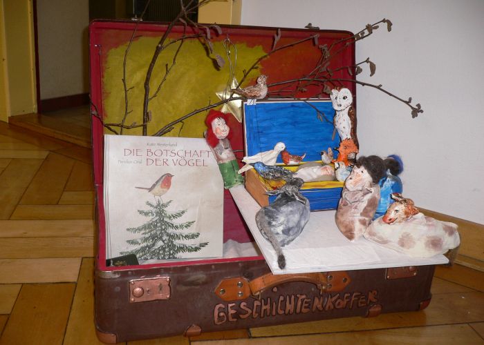 Frau Elisabeth Aebischer hatte ihren Geschichtenkoffer mitgebracht. Darin verbarg sich eine besinnliches Weihnachtsbuch, Vögel und verschiedene Figuren, die zur Geschichte gehörten.