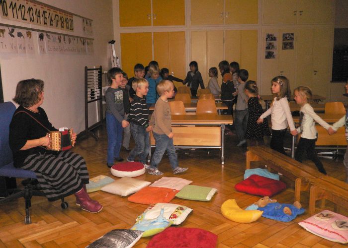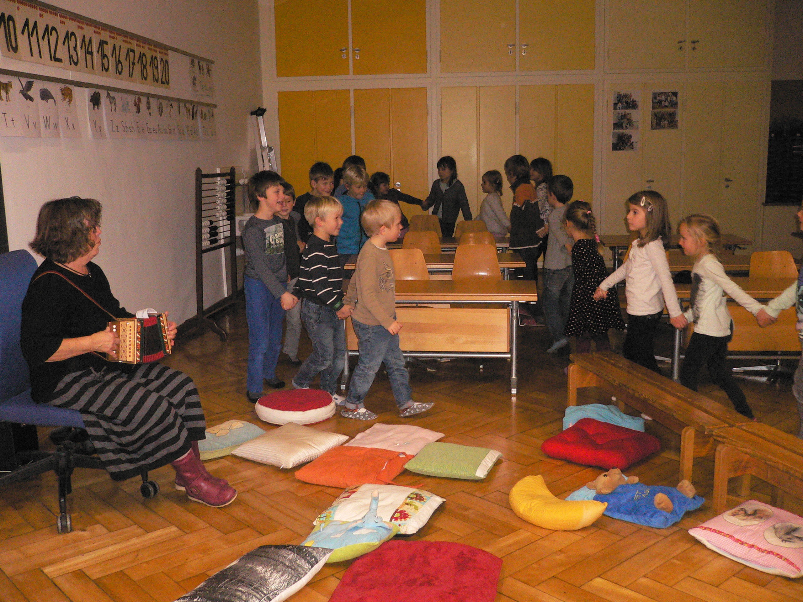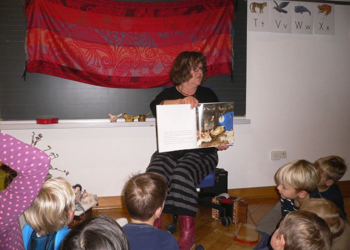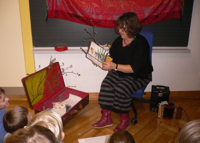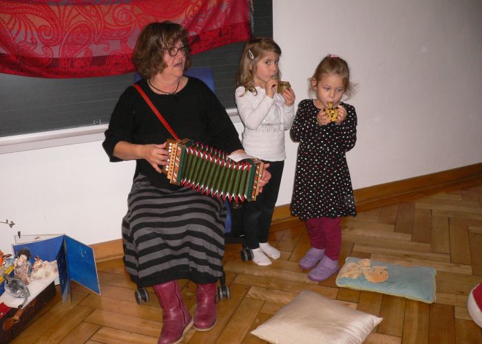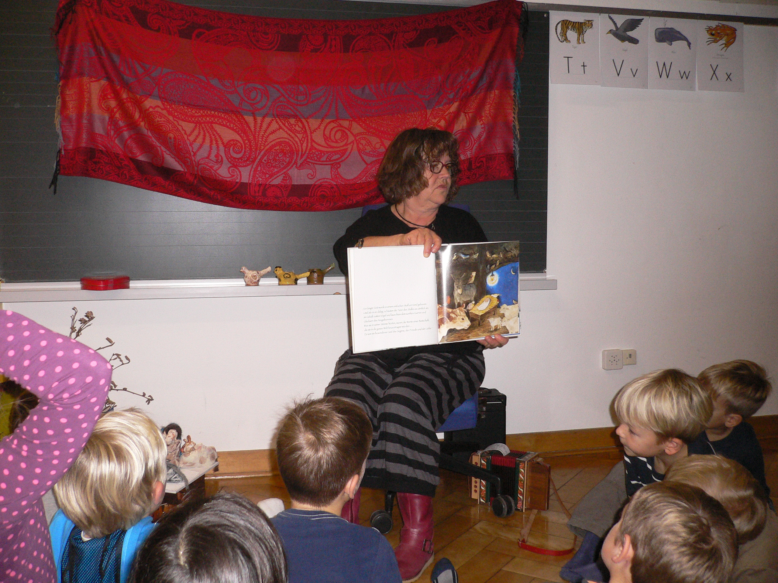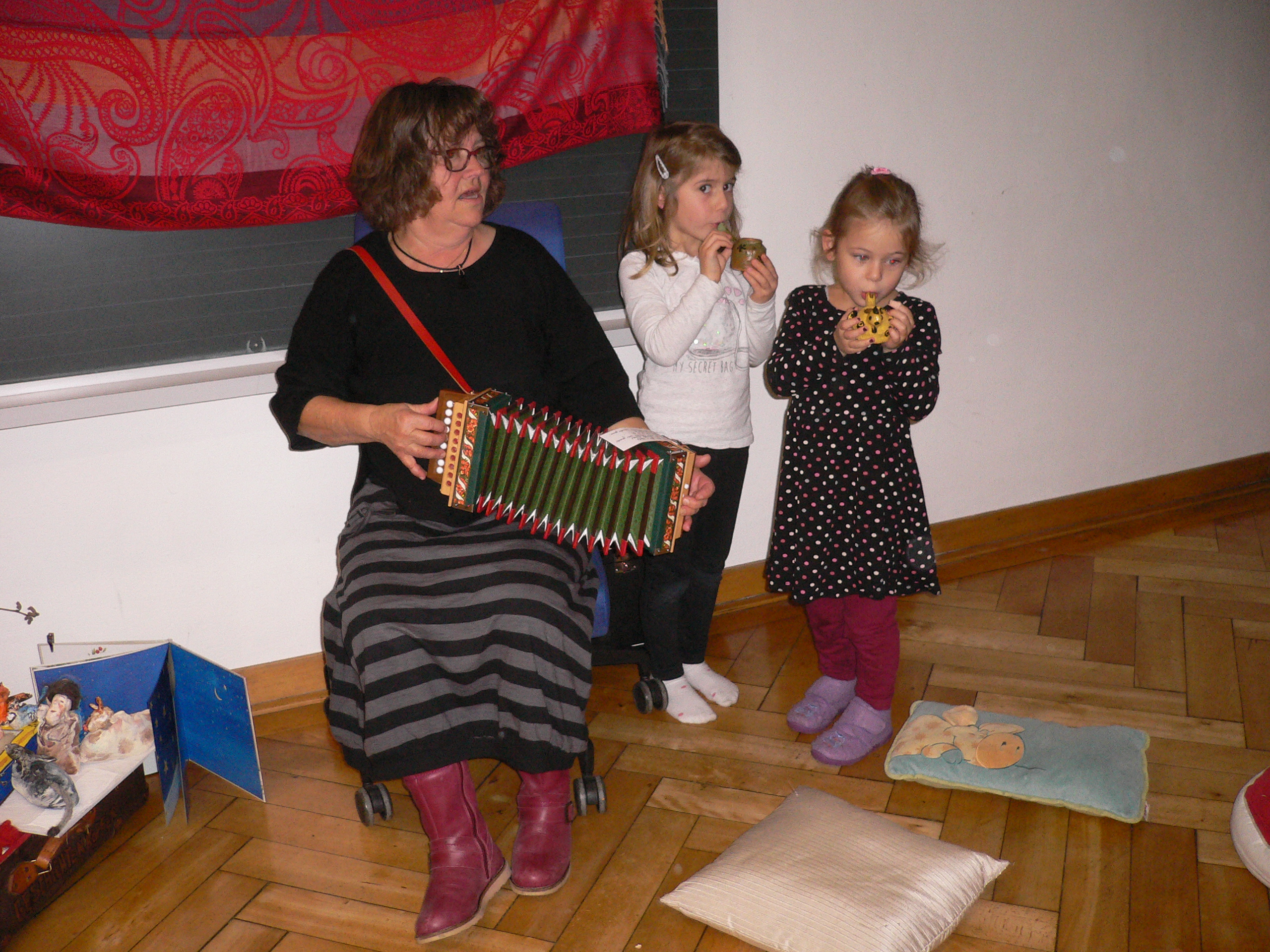 Frau Elisabeth Aebischer hatte ihren Geschichtenkoffer mitgebracht. Darin verbarg sich eine besinnliches Weihnachtsbuch, Vögel und verschiedene Figuren, die zur Geschichte gehörten.