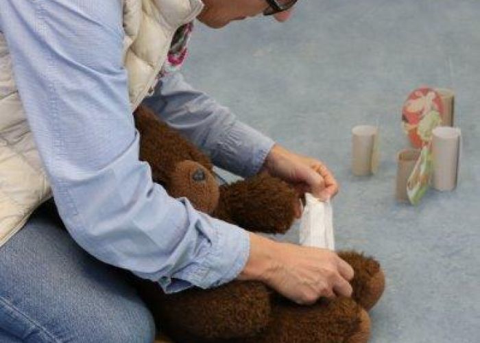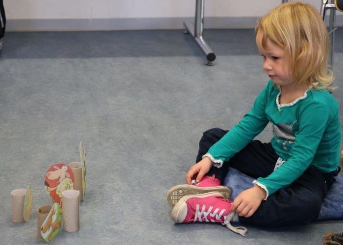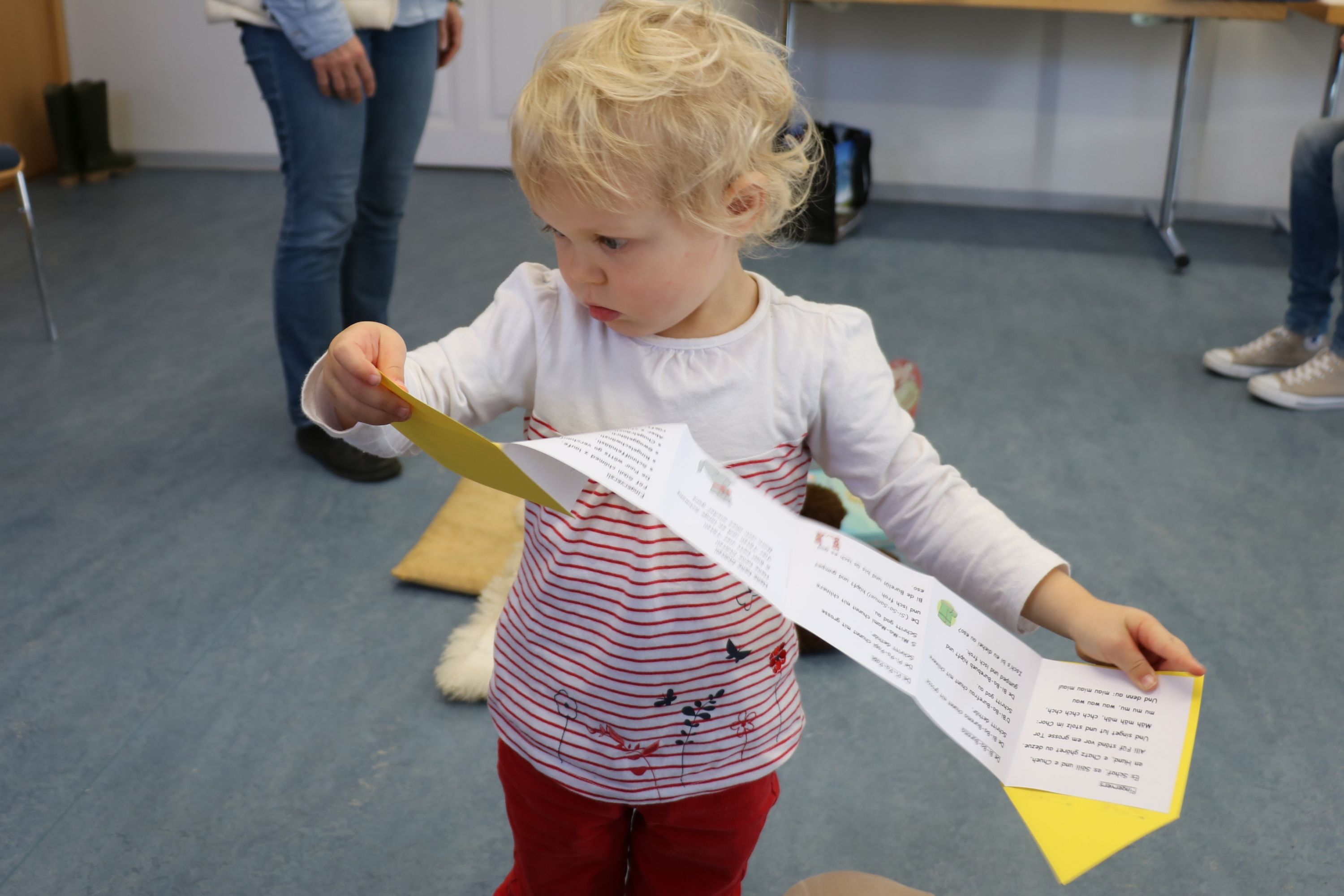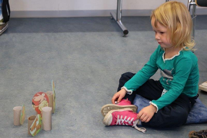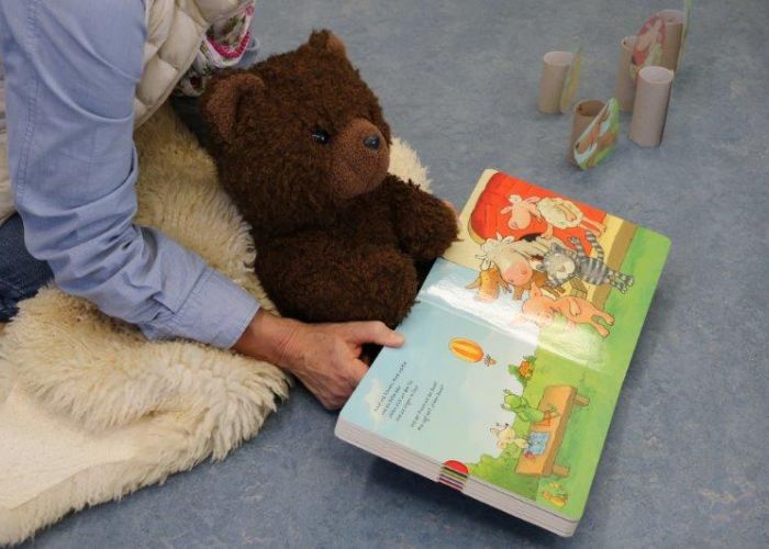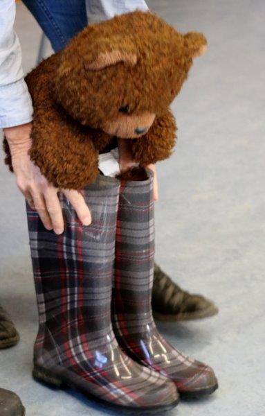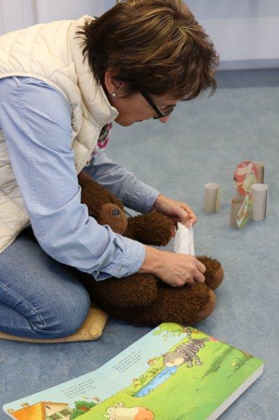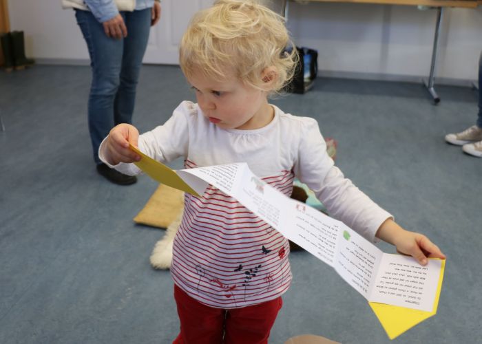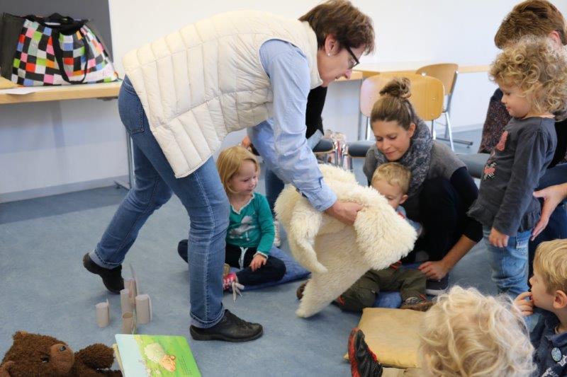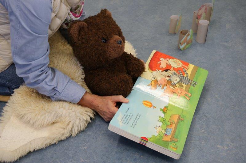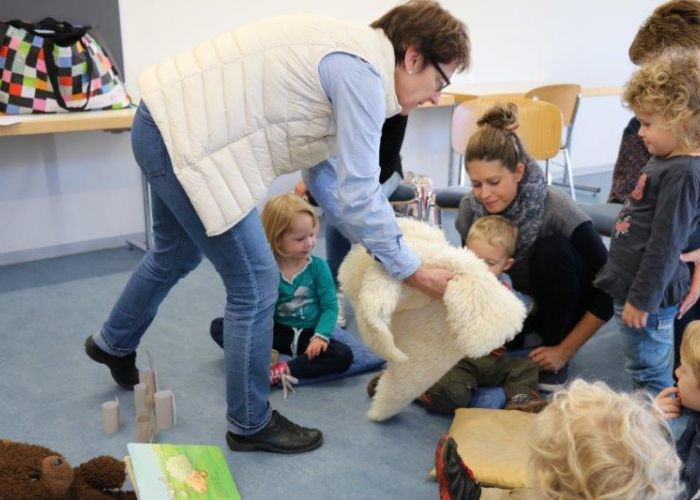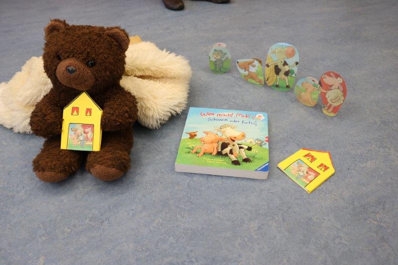 Der Biblio-Bär begrüsste die Kinder und ihre Mamis und Grossmamis. „Wieso hät dä Bär ä Pflästerli?“ war immer wieder zu hören. Trotz seiner Verletzung stieg der Bär in seine grossen Gummistiefel und marschierte mit fröhlichen Sprüchli über den Bauernhof. Die Kinder erfuhren, dass er beim Honigsuchen vom Baum fiel. Dank einem Büsi-Heilesäge-Versli heilte seine Verletzung jedoch rasch. Anschliessend nahm Elisabeth Solèr alle mit auf eine geräuschvolle Entdeckungsreise zu den Bauernhof-Tieren. „Wer macht „Muh“? Schwein oder Kuh?“ von Michael Schober und Regina Schwarz ist ein Bilderbuch mit täuschend echten Tierlauten. So ertönte am Ende der Geschichtenzeit ein fröhliches Tierkonzert durch den Raum. Als Erinnerung durfte jedes Kind ein Bauernhof-Büechli mit allen Versli des Morgens mit nach Hause nehmen. Mit Büechli anschauen und erzählen klang der Morgen in der Bibliothek aus.