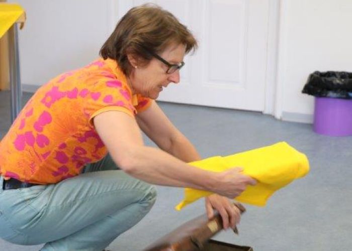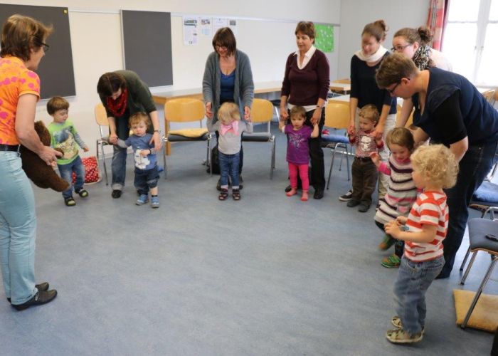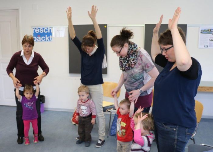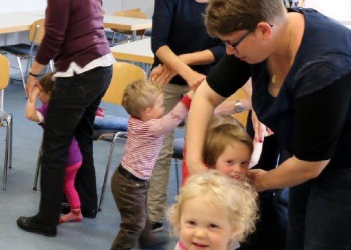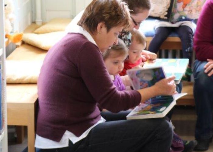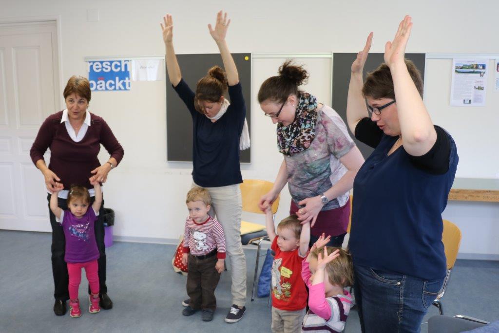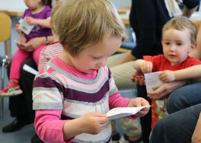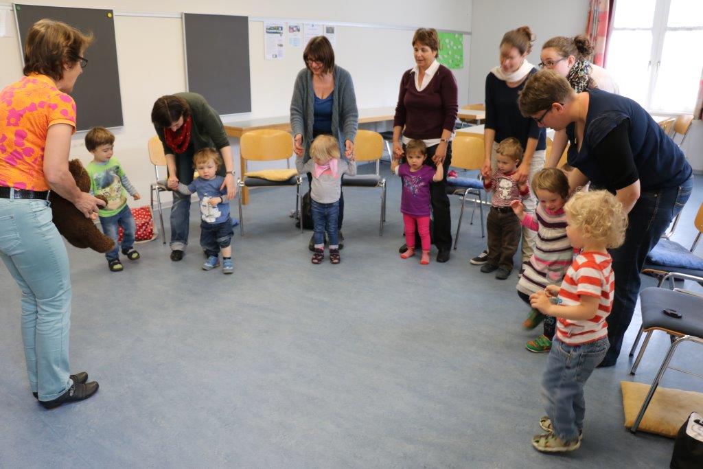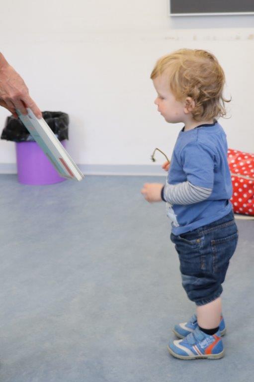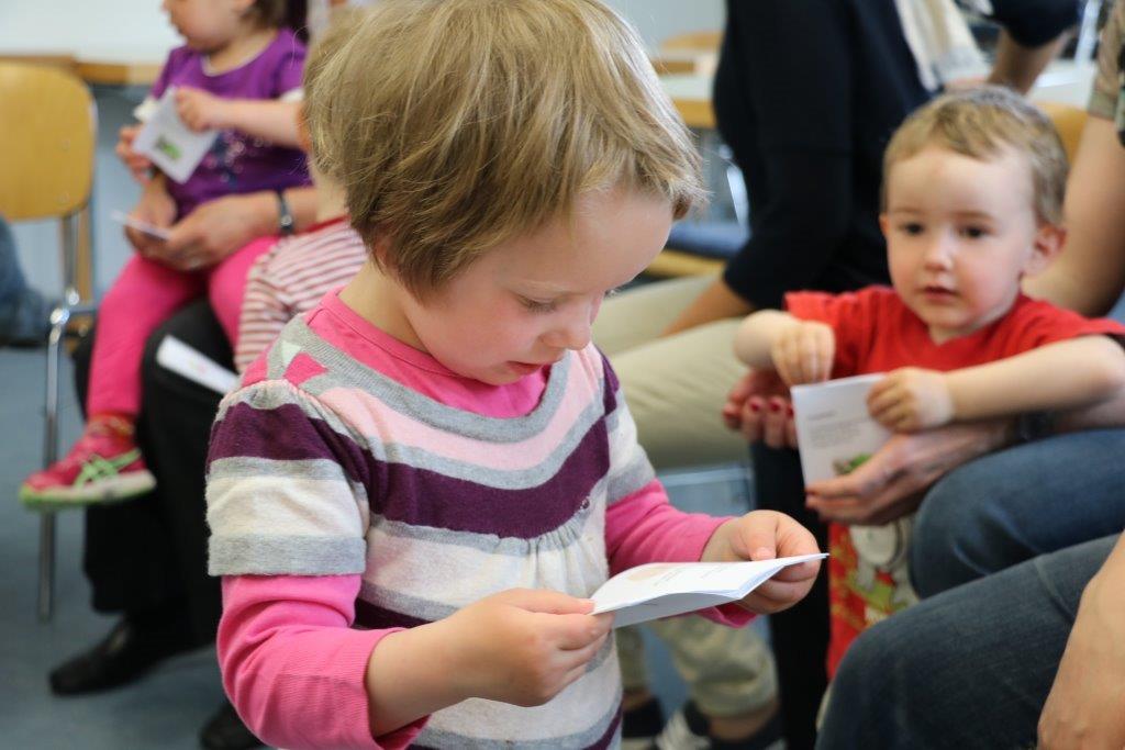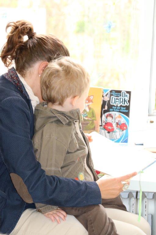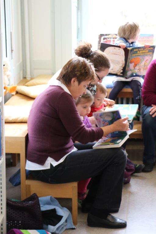 Wer kennt das nicht, man sieht oder riecht etwas wunderbar Gutes - aber es ist einfach so weit oben. Genau so erging es dem Bär in der Geschichte, die uns Elisabeth Solèr am Frühlingsanlass für die Kleinsten erzählte. Der Bär bekam Hilfe von vielen anderen Tieren, und zu jedem wusste Elisabeth Solèr ein Versli und passende Bewegungen. Die Kinder mit ihren Mamis und Grossmamis machten freudig mit. Als der Frosch den Kuchen tatsächlich beinahe erreichte, öffnete sich das Fenster und ein Mädchen nahm den Kuchen weg. Doch glücklicherweise brachte das Mädchen den Kuchen zur Tür und teilte ihn mit allen Tieren ("So weit oben", Susanne Strasser, Hammer Verlag). Nach dem Schlusslied gab es zwar keinen Kuchen, dafür durften in der Bibliothek die (gut erreichbaren) Kinderbücher angeschaut, erzählt und ausgeliehen werden.