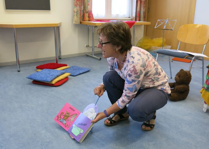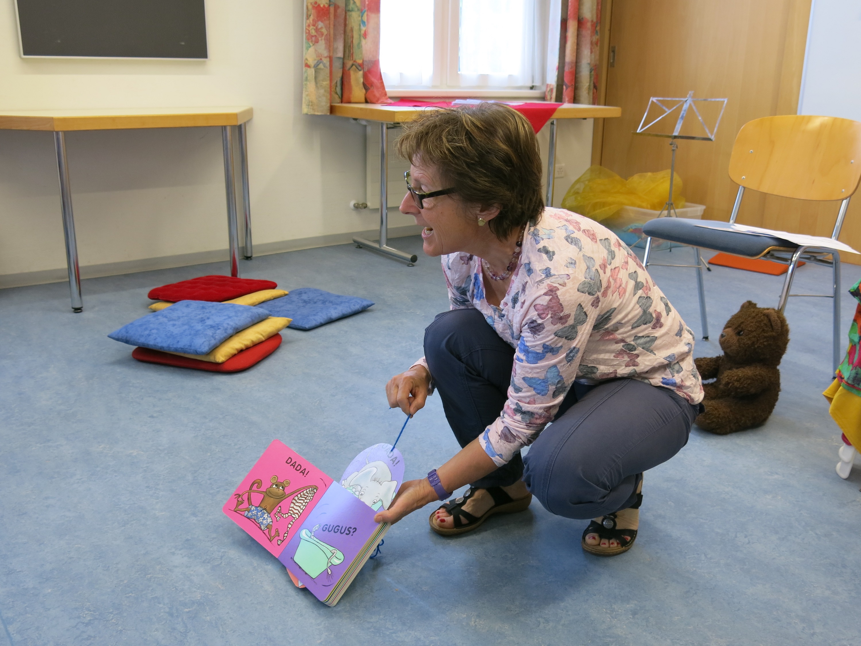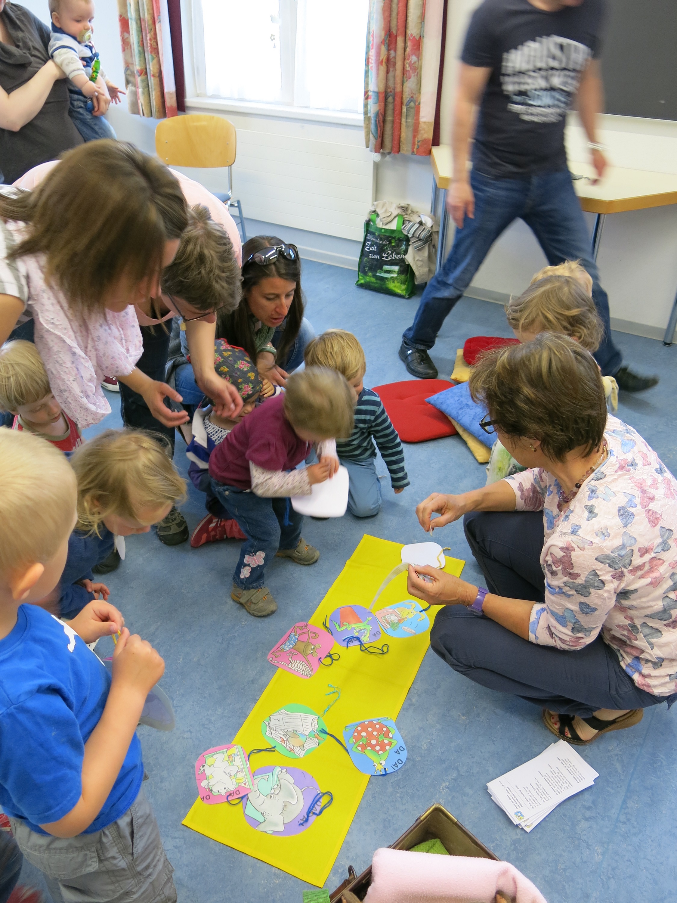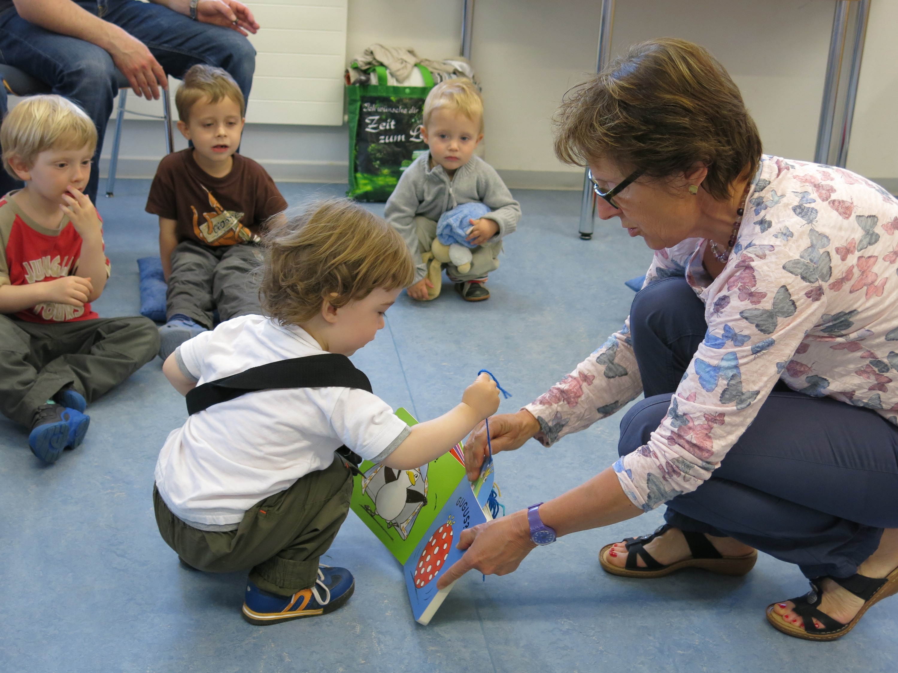 Gugus? Am „Reim & Spiel“-Buchstart-Anlass der Bibliothek Ebnat-Kappel am 11. Mai begrüsste Elisabeth Solèr die fröhliche Schar Kleinkinder mit ihren Eltern mit einem Koffer, in dem sich jemand versteckte. Bald machte ein kleines Äffchen aus dem Koffer heraus „Dada!“ und brachte auch gleich ein Buch mit, in welchem sich noch viele weitere Tiere versteckten. Die Kinder durften die Tiere raten und aufdecken. Frau Solèr hatte zu den aufgedeckten Tieren passende Reime oder Kinderlieder dabei. Freudig wurde entdeckt, gesungen und mitgemacht. Jedes Kind durfte als Erinnerung eine aufgedeckte Tierkarte mitnehmen. Anschliessend konnte in der Bibliothek nach Herzenslust in den zahlreichen Kinderbüchern geschmökert werden. Der nächste Buchstart-Anlass findet im November statt.
