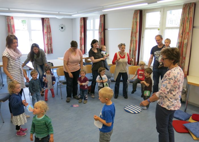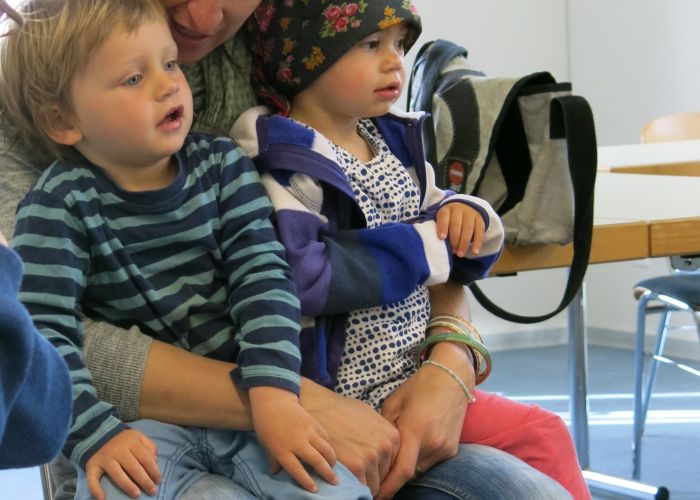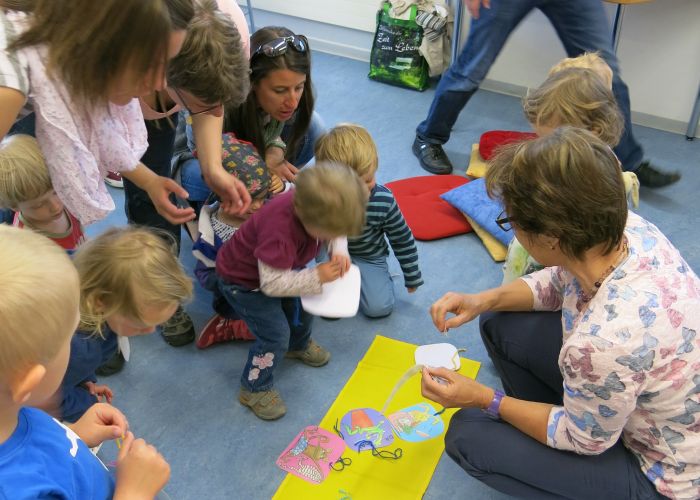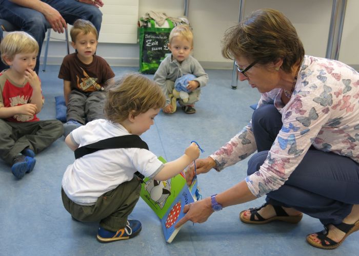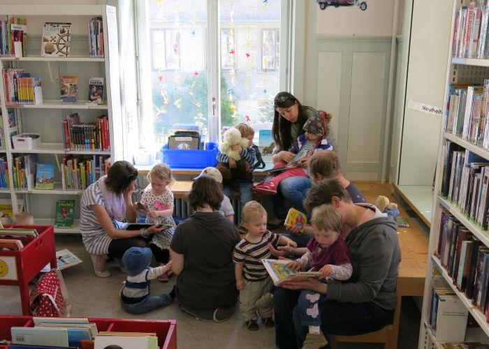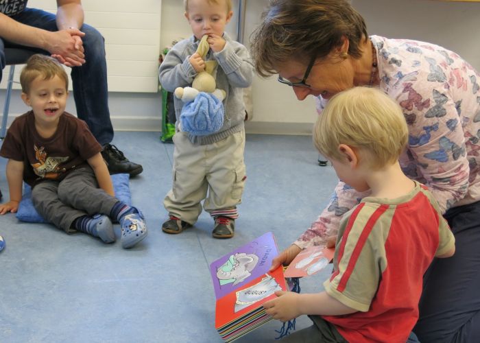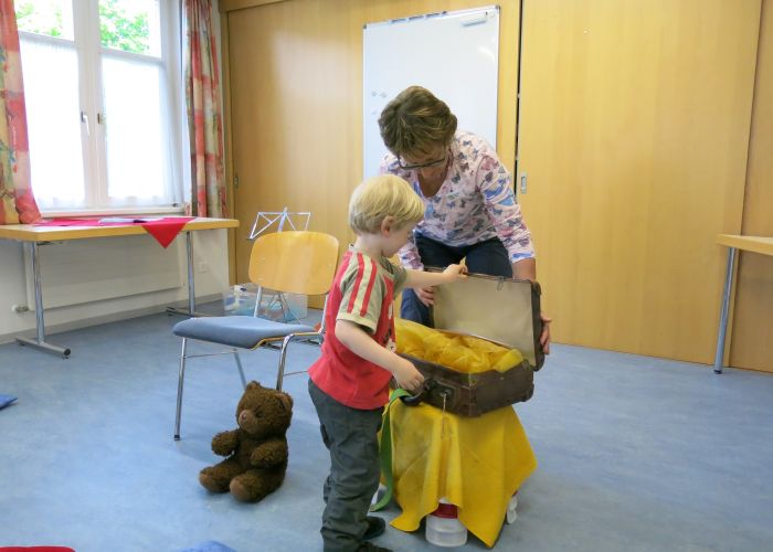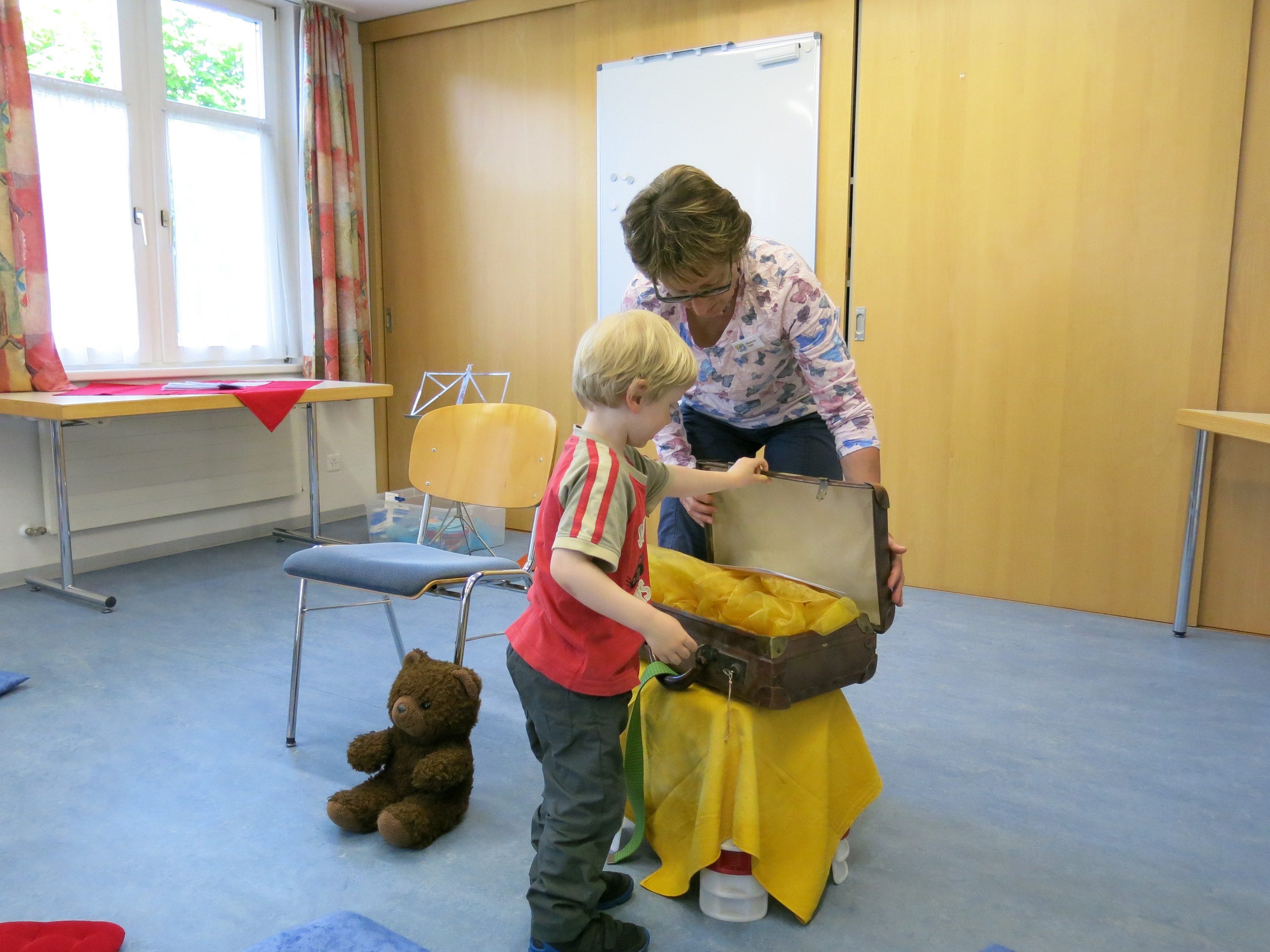 Gugus? Am „Reim & Spiel“-Buchstart-Anlass der Bibliothek Ebnat-Kappel am 11. Mai begrüsste Elisabeth Solèr die fröhliche Schar Kleinkinder mit ihren Eltern mit einem Koffer, in dem sich jemand versteckte. Bald machte ein kleines Äffchen aus dem Koffer heraus „Dada!“ und brachte auch gleich ein Buch mit, in welchem sich noch viele weitere Tiere versteckten. Die Kinder durften die Tiere raten und aufdecken. Frau Solèr hatte zu den aufgedeckten Tieren passende Reime oder Kinderlieder dabei. Freudig wurde entdeckt, gesungen und mitgemacht. Jedes Kind durfte als Erinnerung eine aufgedeckte Tierkarte mitnehmen. Anschliessend konnte in der Bibliothek nach Herzenslust in den zahlreichen Kinderbüchern geschmökert werden. Der nächste Buchstart-Anlass findet im November statt.