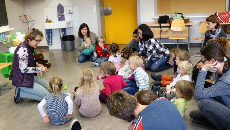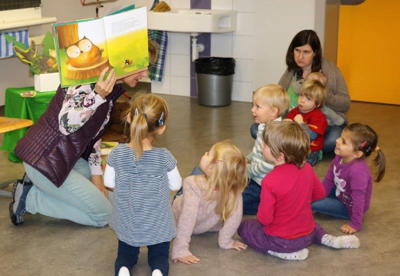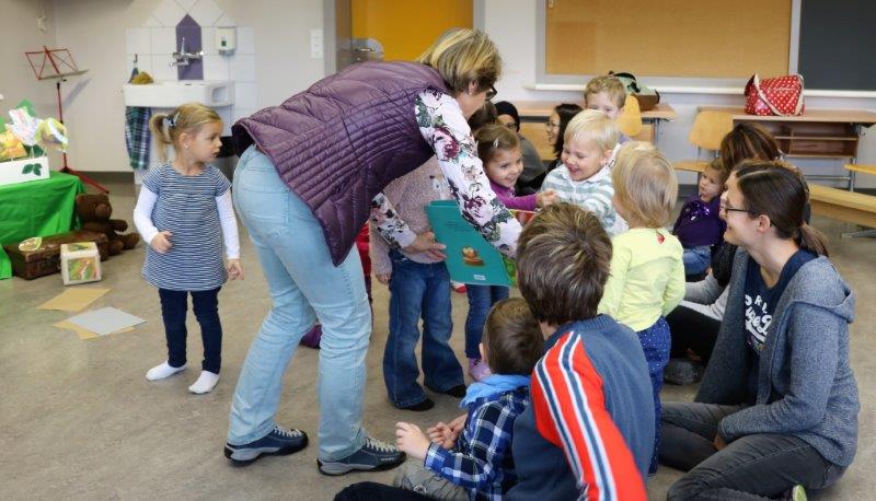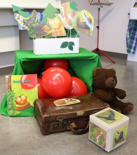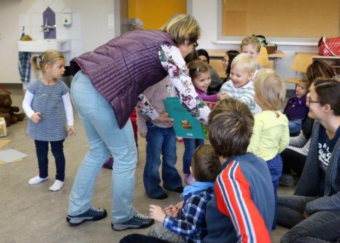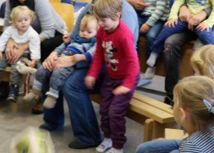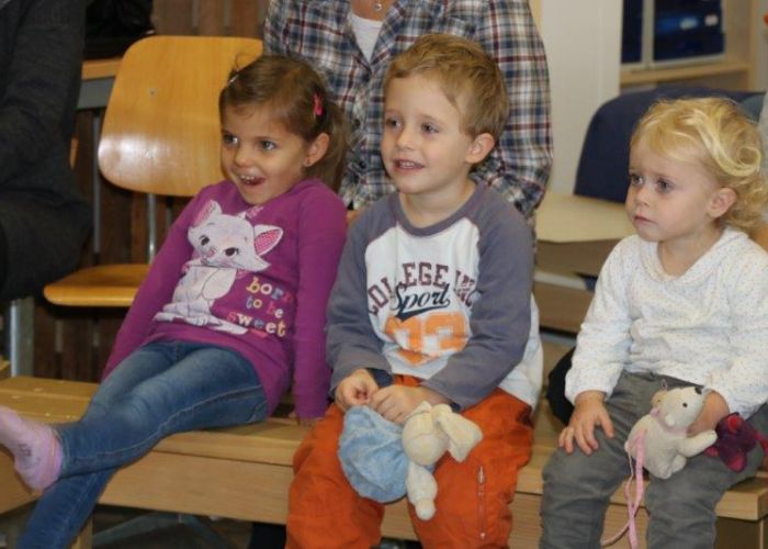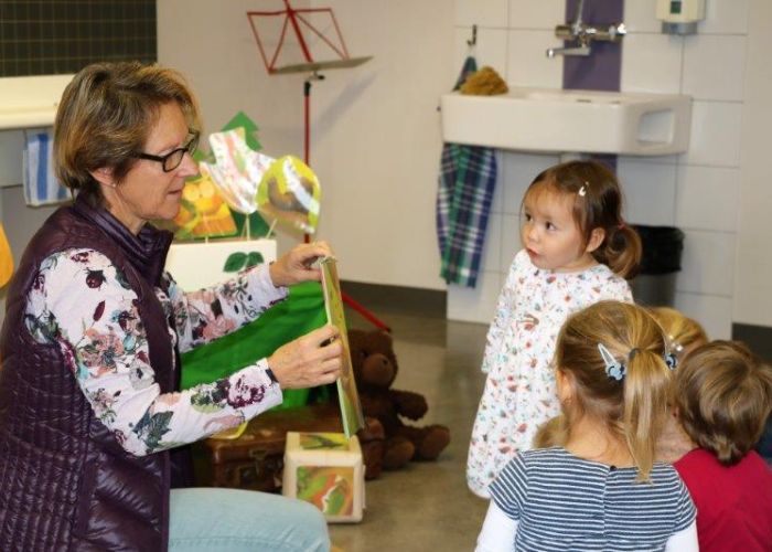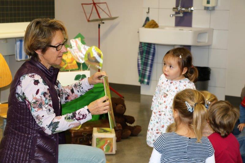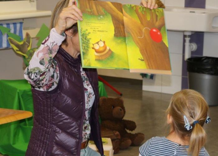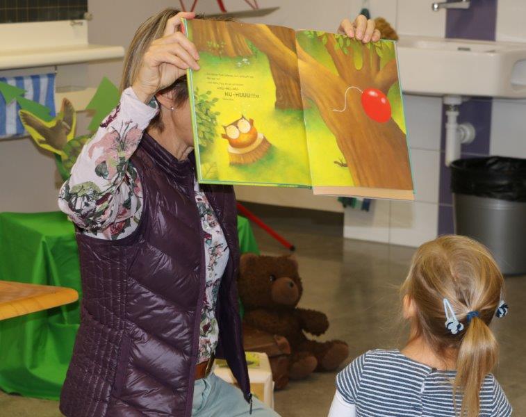 Gespannt folgten die 15 Kinder mit ihren Mamis und Grossmamis der Geschichte der Heule-Eule und ihrem roten Luftballon. Mit Liedern, Verslis und Bewegung erzählte die Bibliothekarin Elisabeth Solèr, wie die kleine Eule mit Hilfe ihrer Freunde ihr verlorenes "Bumm" wieder fand (Friester, Paul: Heule Eule: ich will mein Bumm!; NordSüd).Danach durften die Kinder, ausgerüstet mit einem eigenen roten Ballon und den gehörten Versli, in der Bibliothek Bücher anschauen und ausleihen.
