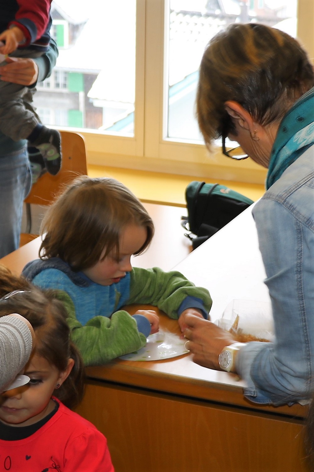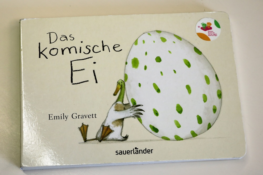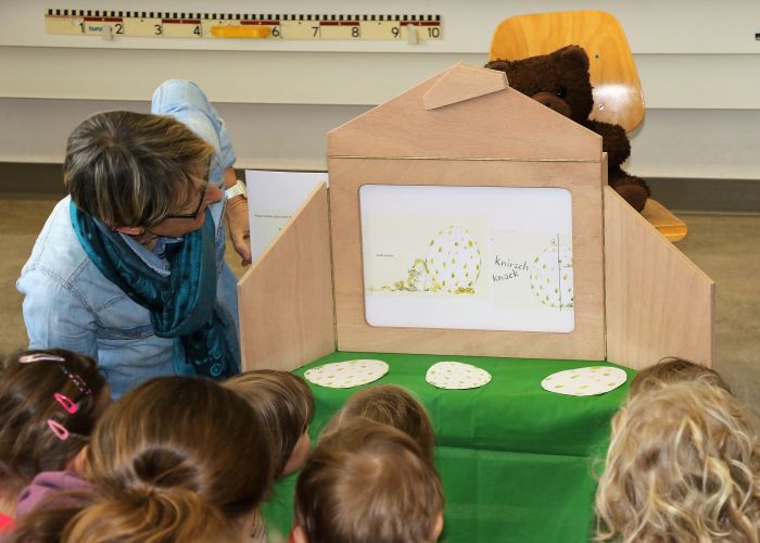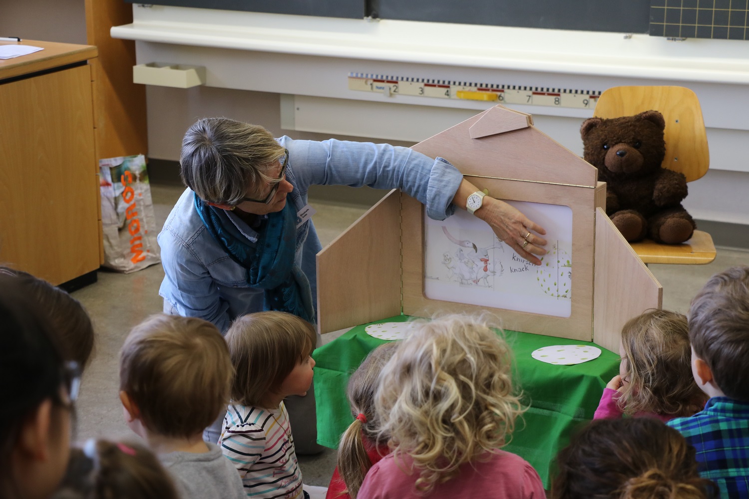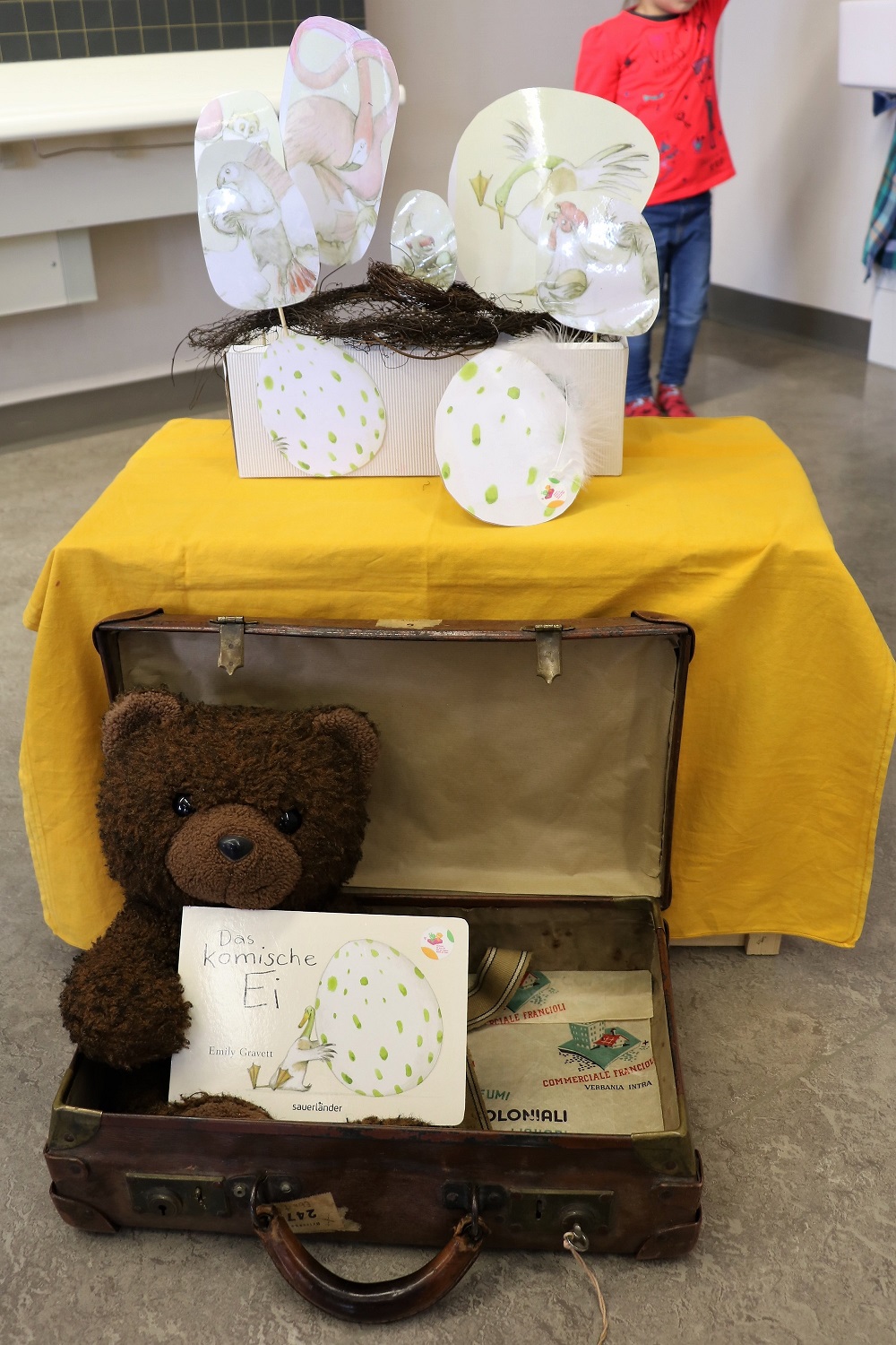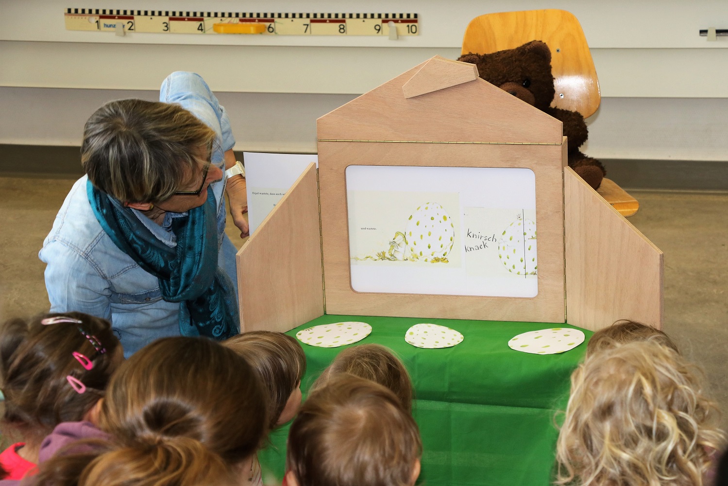 Wer hat sich heute wohl im Geschichtenkoffer versteckt? Gespannt lauschen die zahlreich erschienen Kinder mit ihren Mamis und Grossmamis, als Elisabeth Solèr den Deckel öffnet. Es gackert und pfeift und bald flattern verschiedenste Vögel aus dem Koffer. Mit dem Kamishibai, einem japanischen Geschichtenkoffer, erzählt die Bibliothekarin die witzige Geschichte vom komischen Ei (Gravett, Emily: Das komische Ei. Sauerländer). Alle Vögel haben ein schönes Ei gelegt und brüten fleissig. Nur der Entenerpel hat kein Ei. Da findet er das grösste, schönste Ei. Gespannt warten die Kinder, bis auch sein Ei endlich Risse bekommt und ein unerwartetes Tier heraus schlüpft... Die Versli werden mit Freude mitgemacht.