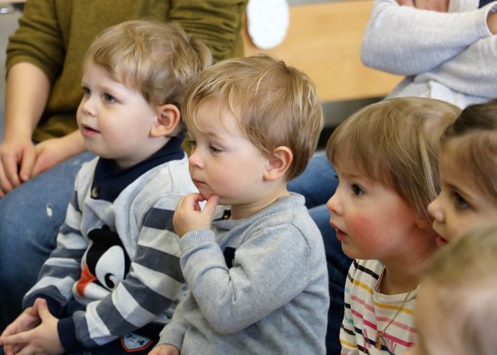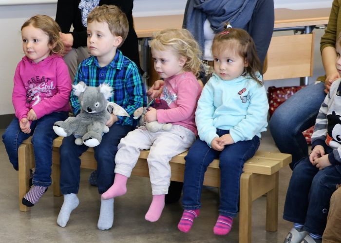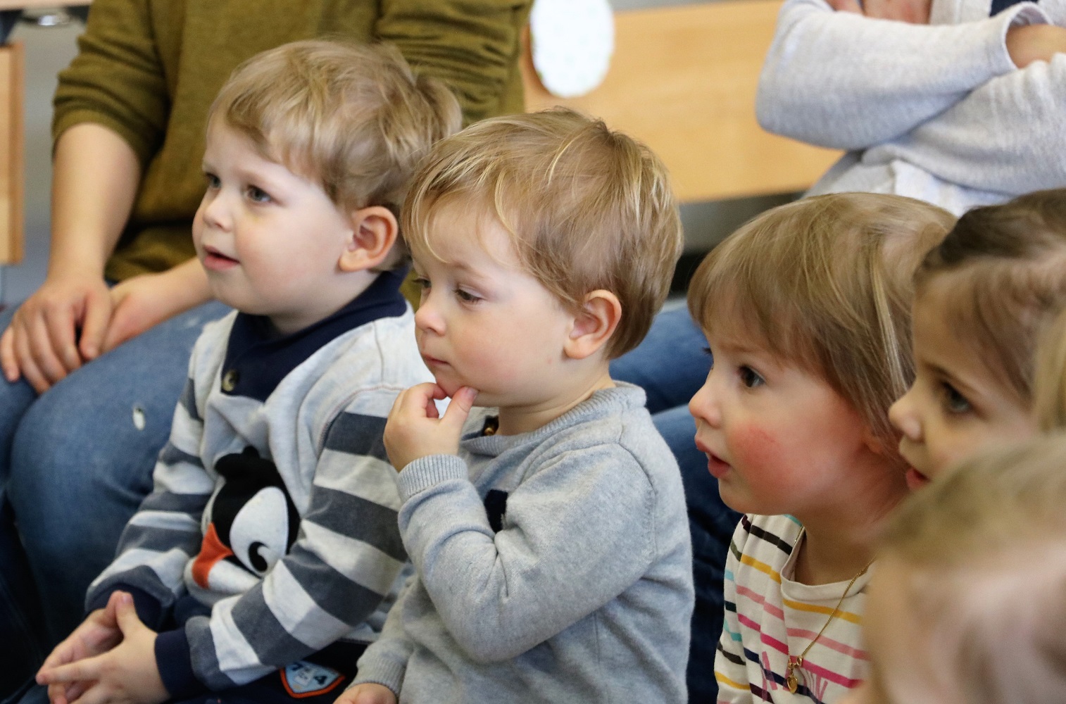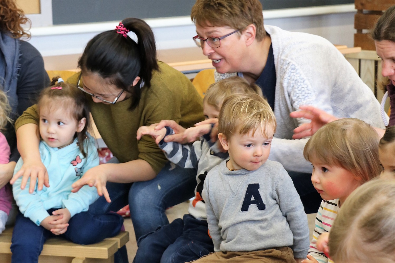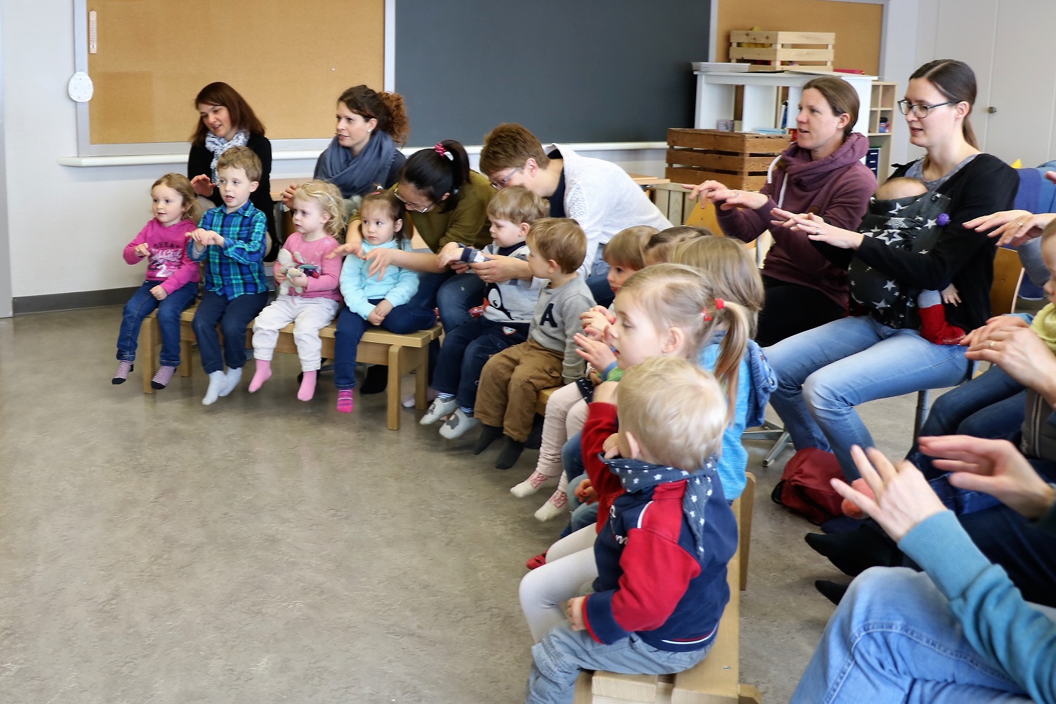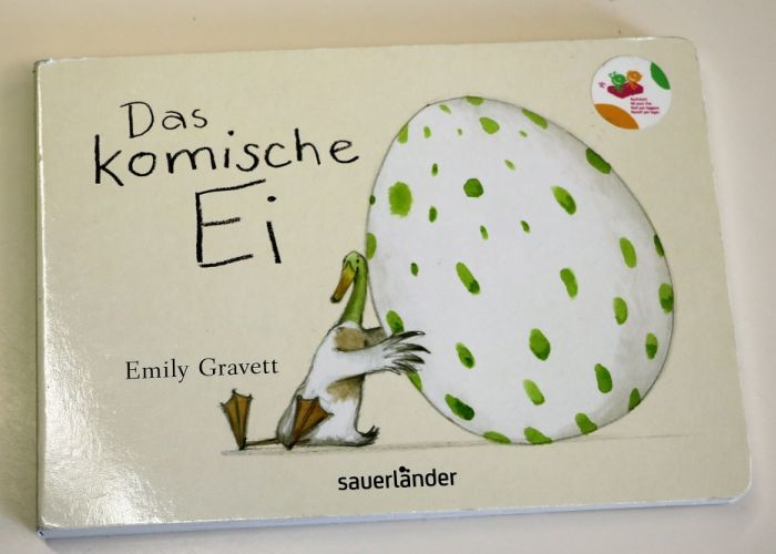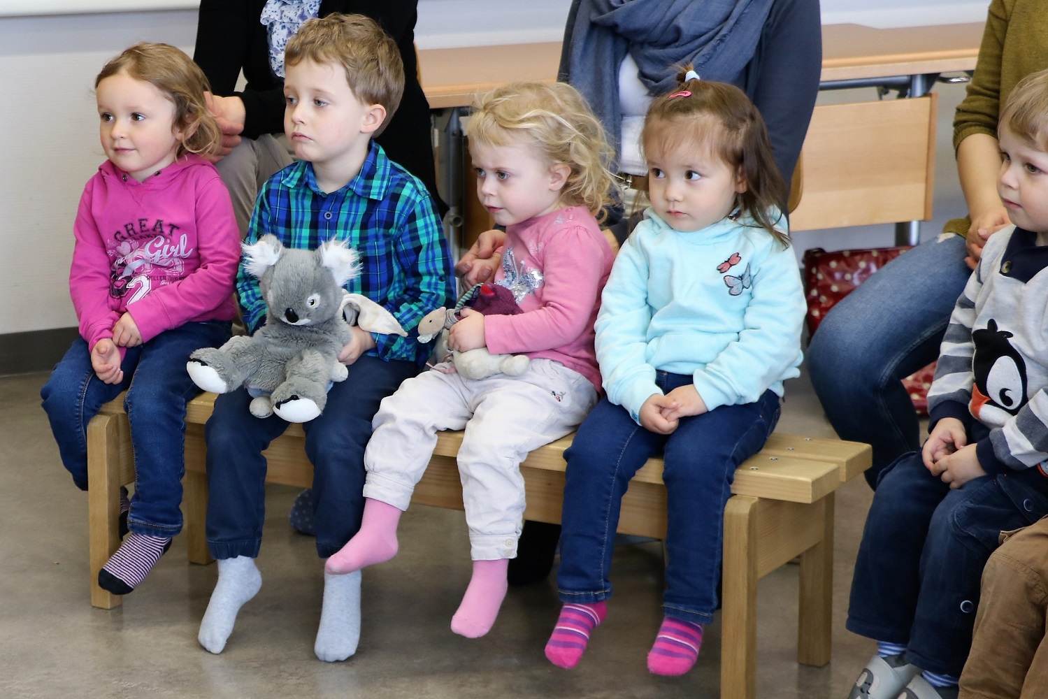 Wer hat sich heute wohl im Geschichtenkoffer versteckt? Gespannt lauschen die zahlreich erschienen Kinder mit ihren Mamis und Grossmamis, als Elisabeth Solèr den Deckel öffnet. Es gackert und pfeift und bald flattern verschiedenste Vögel aus dem Koffer. Mit dem Kamishibai, einem japanischen Geschichtenkoffer, erzählt die Bibliothekarin die witzige Geschichte vom komischen Ei (Gravett, Emily: Das komische Ei. Sauerländer). Alle Vögel haben ein schönes Ei gelegt und brüten fleissig. Nur der Entenerpel hat kein Ei. Da findet er das grösste, schönste Ei. Gespannt warten die Kinder, bis auch sein Ei endlich Risse bekommt und ein unerwartetes Tier heraus schlüpft... Die Versli werden mit Freude mitgemacht.