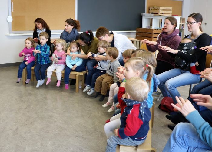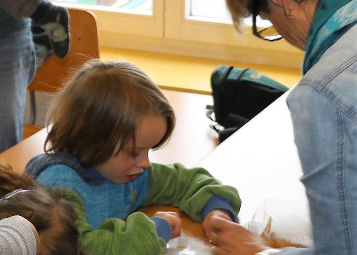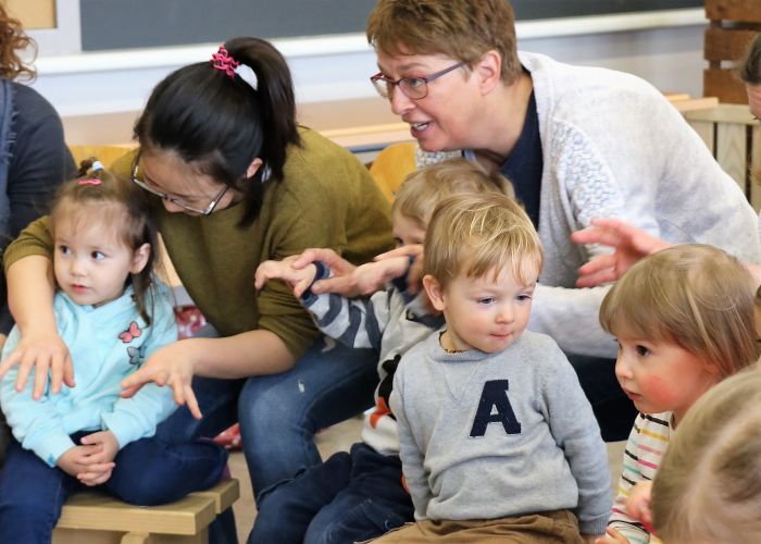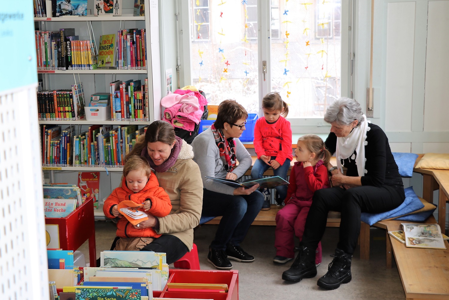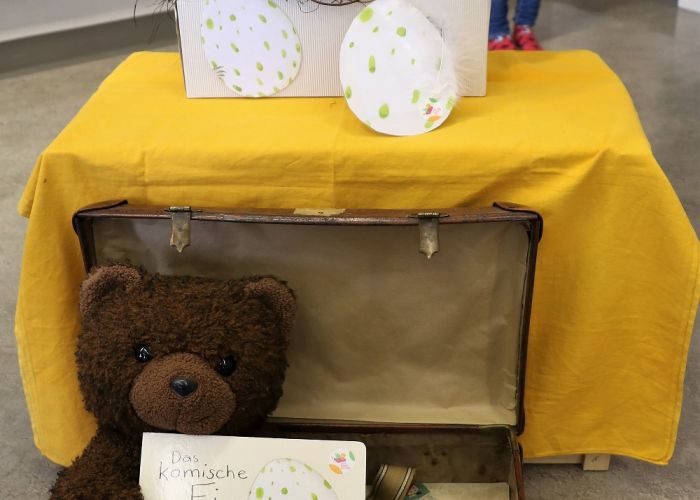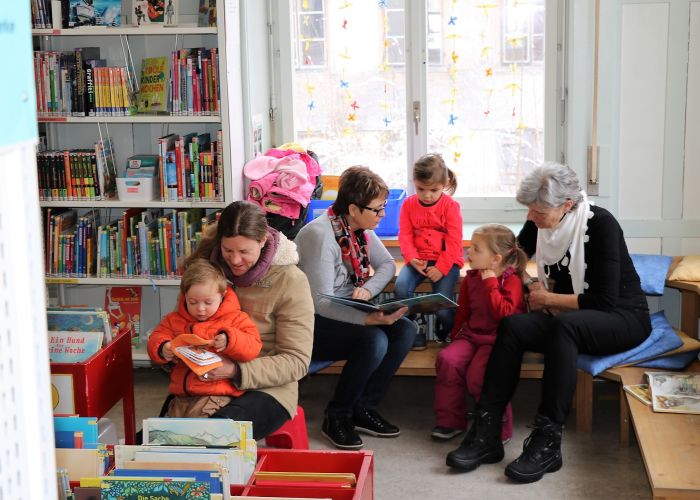 Nach dem Abschlusslied geniesst die Schar freies Bücheranschauen und -erzählen in der Bibliothek. Und bald machen sich zufriedene Kinder, ausgerüstet mit einem geschmückten "komischen Ei" mit den gelernten Sprüchlis, auf den Nachhauseweg.