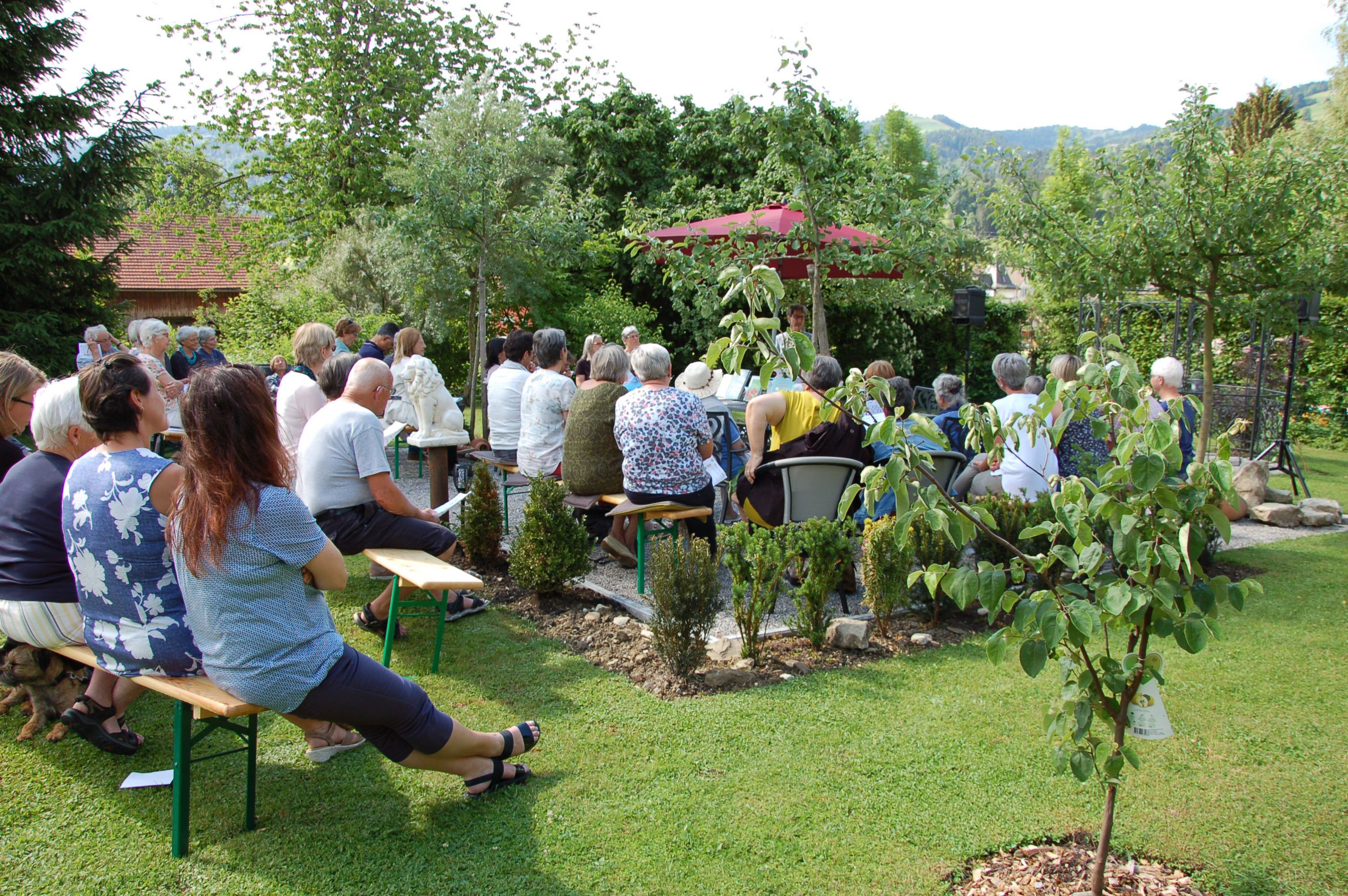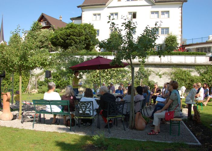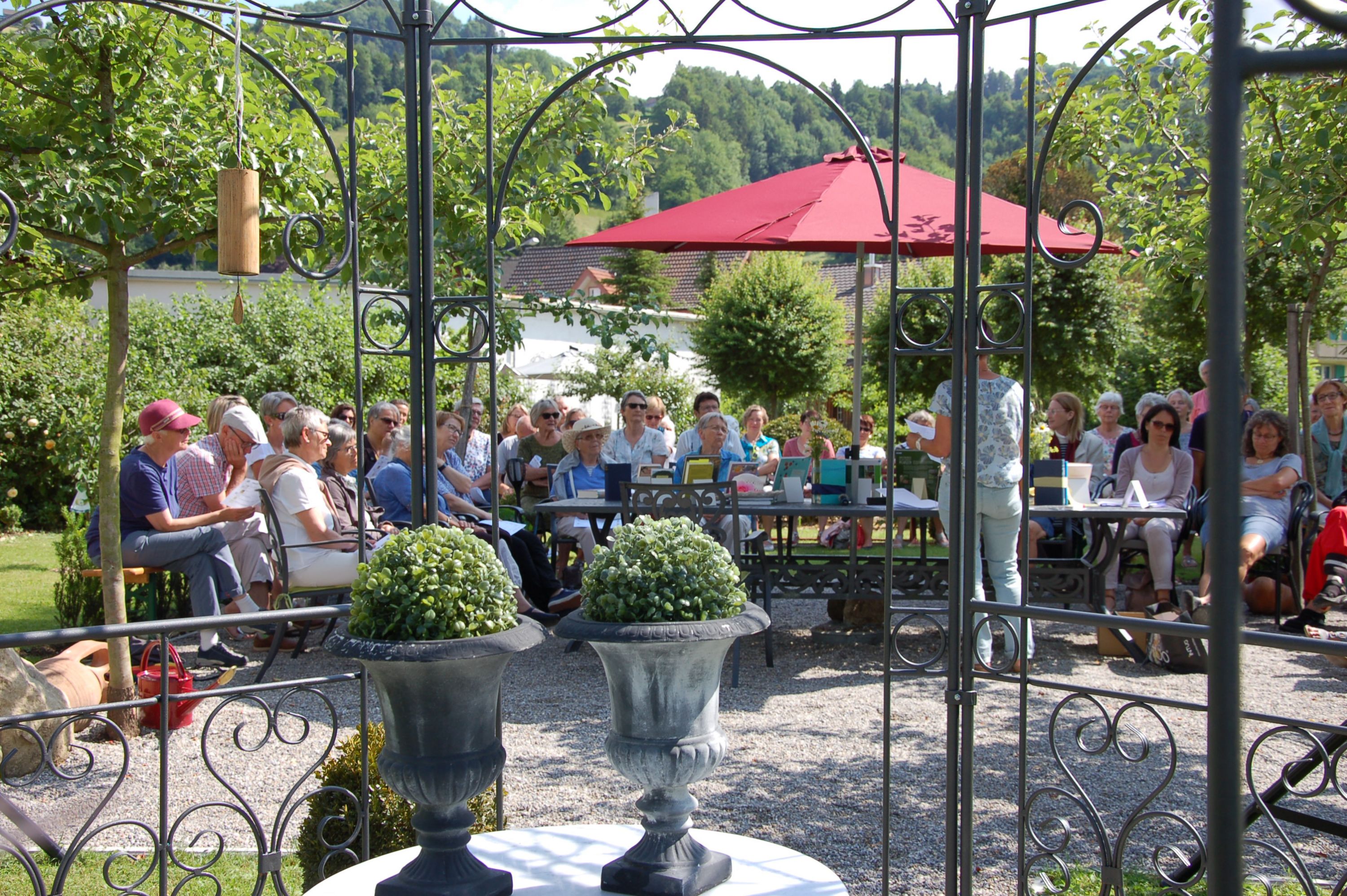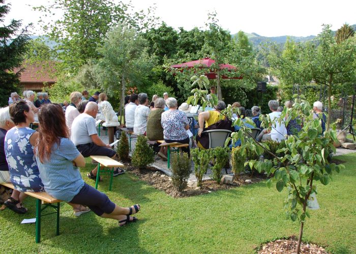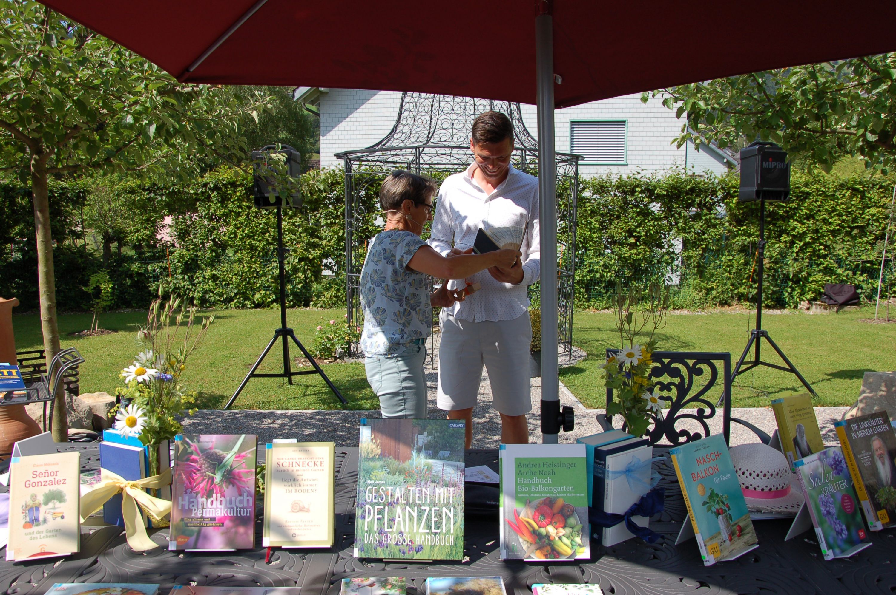 Nach der Präsentation der Bücher genossen die zahlreichen Bücher- und Gartenliebhaber bei strahlendem Sonnenschein einen Rundgang und liessen sich von Frau und Herrn Leitz ihren Garten zeigen. Das Interesse war gross, die Vielfalt an feinem Gemüse, Beeren und farbenprächtigen Blumen liessen die Besucherinnen und Besucher immer wieder stehen bleiben und staunen.