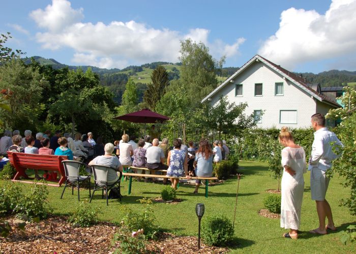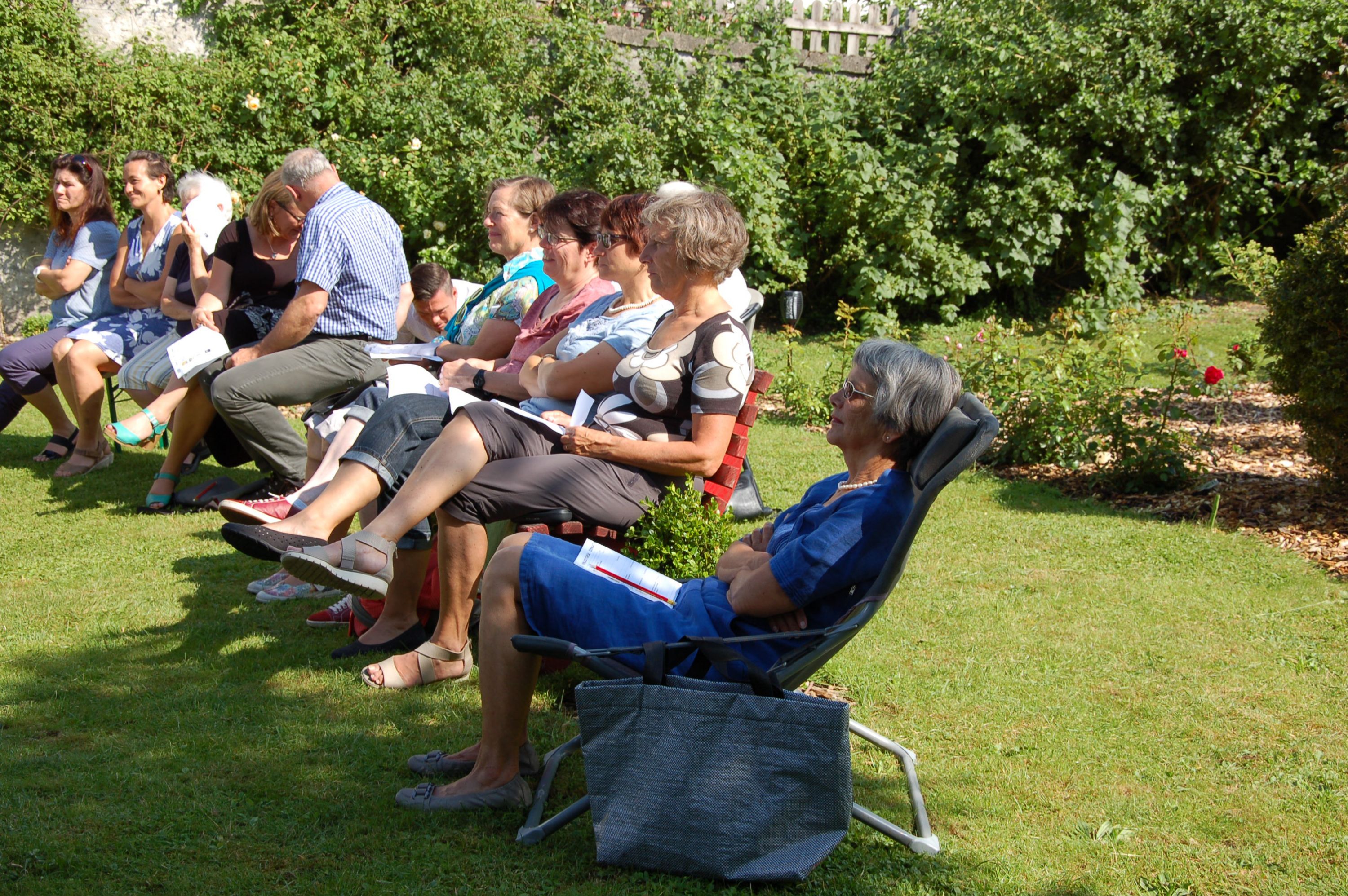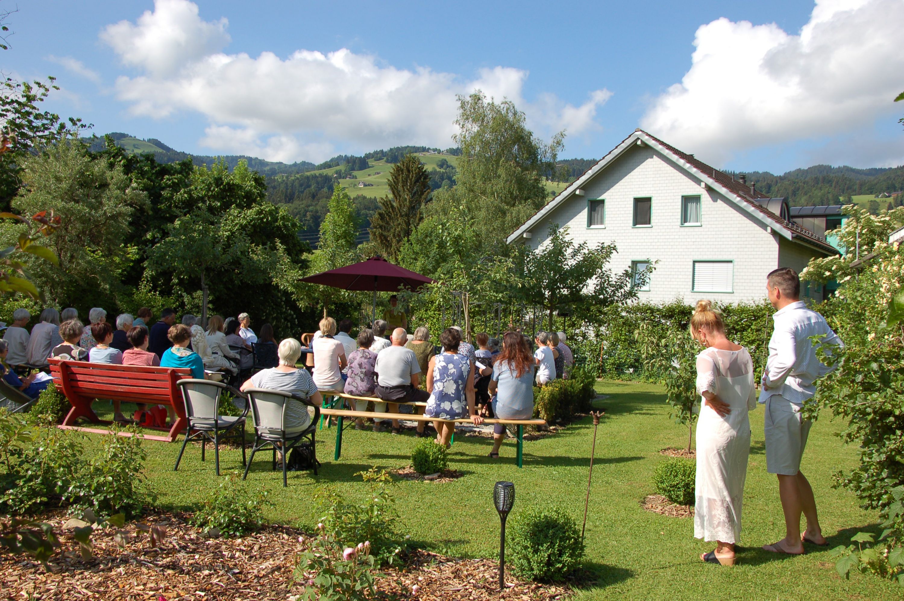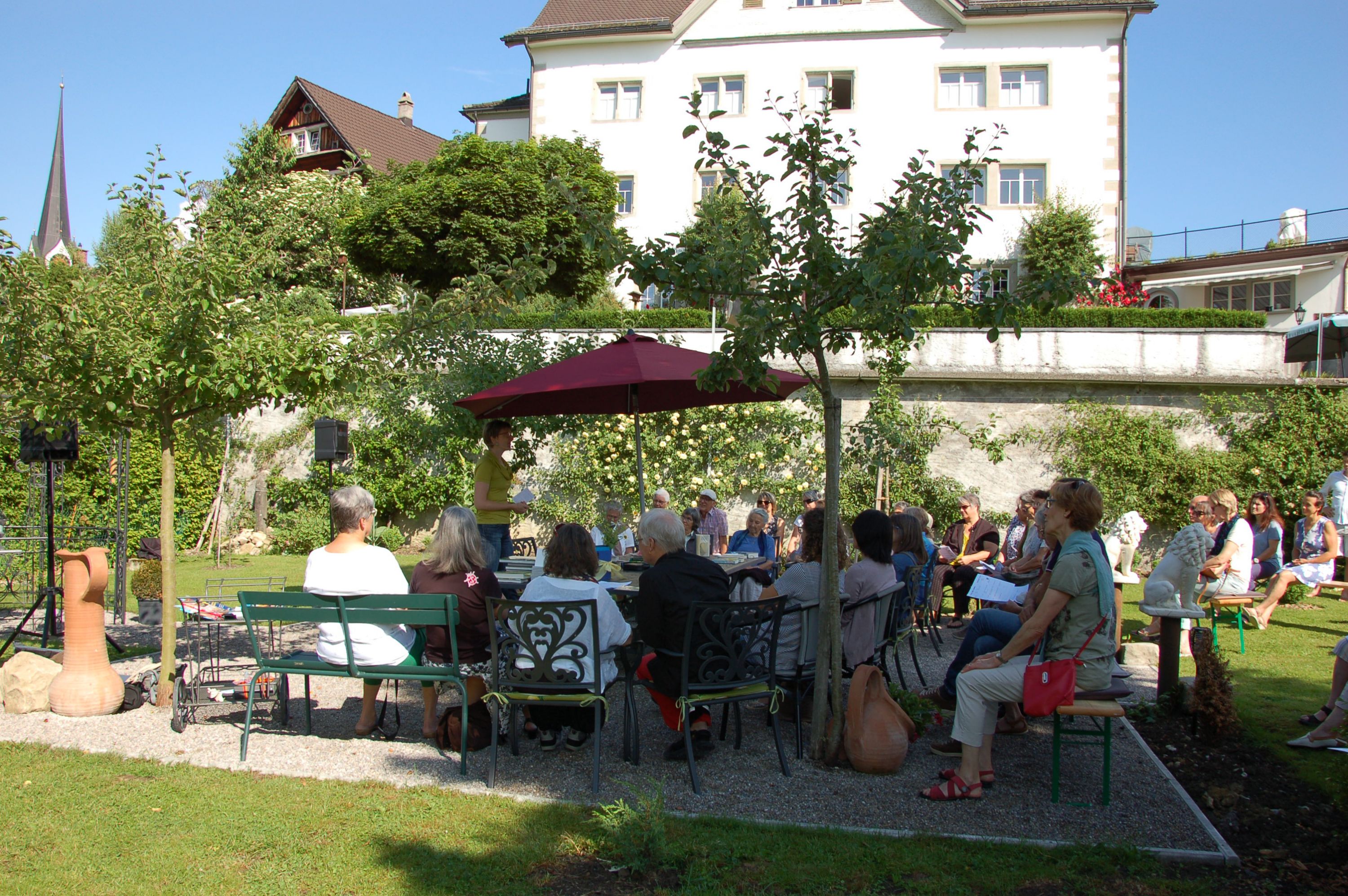 Nach der Präsentation der Bücher genossen die zahlreichen Bücher- und Gartenliebhaber bei strahlendem Sonnenschein einen Rundgang und liessen sich von Frau und Herrn Leitz ihren Garten zeigen. Das Interesse war gross, die Vielfalt an feinem Gemüse, Beeren und farbenprächtigen Blumen liessen die Besucherinnen und Besucher immer wieder stehen bleiben und staunen.