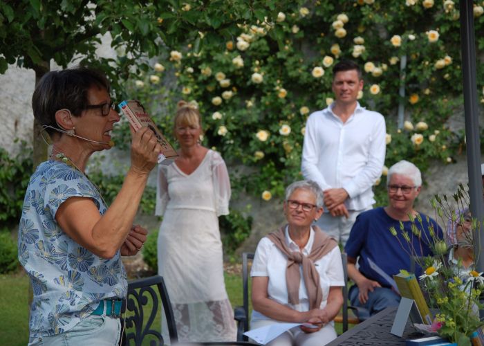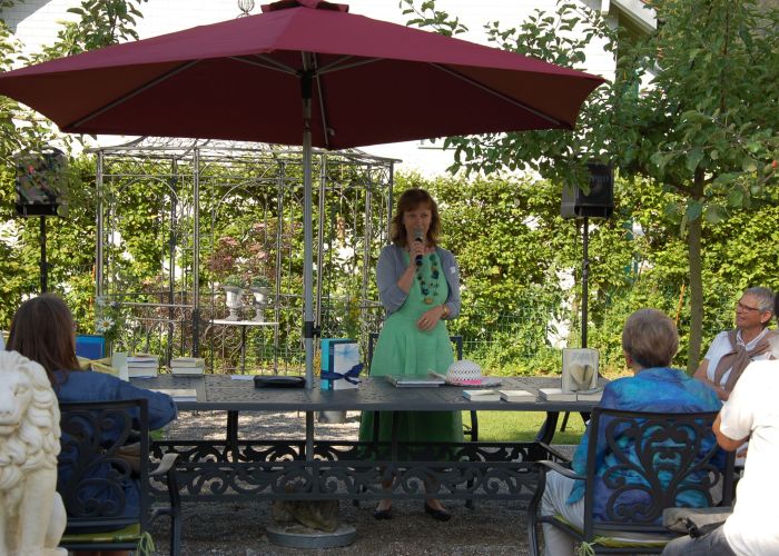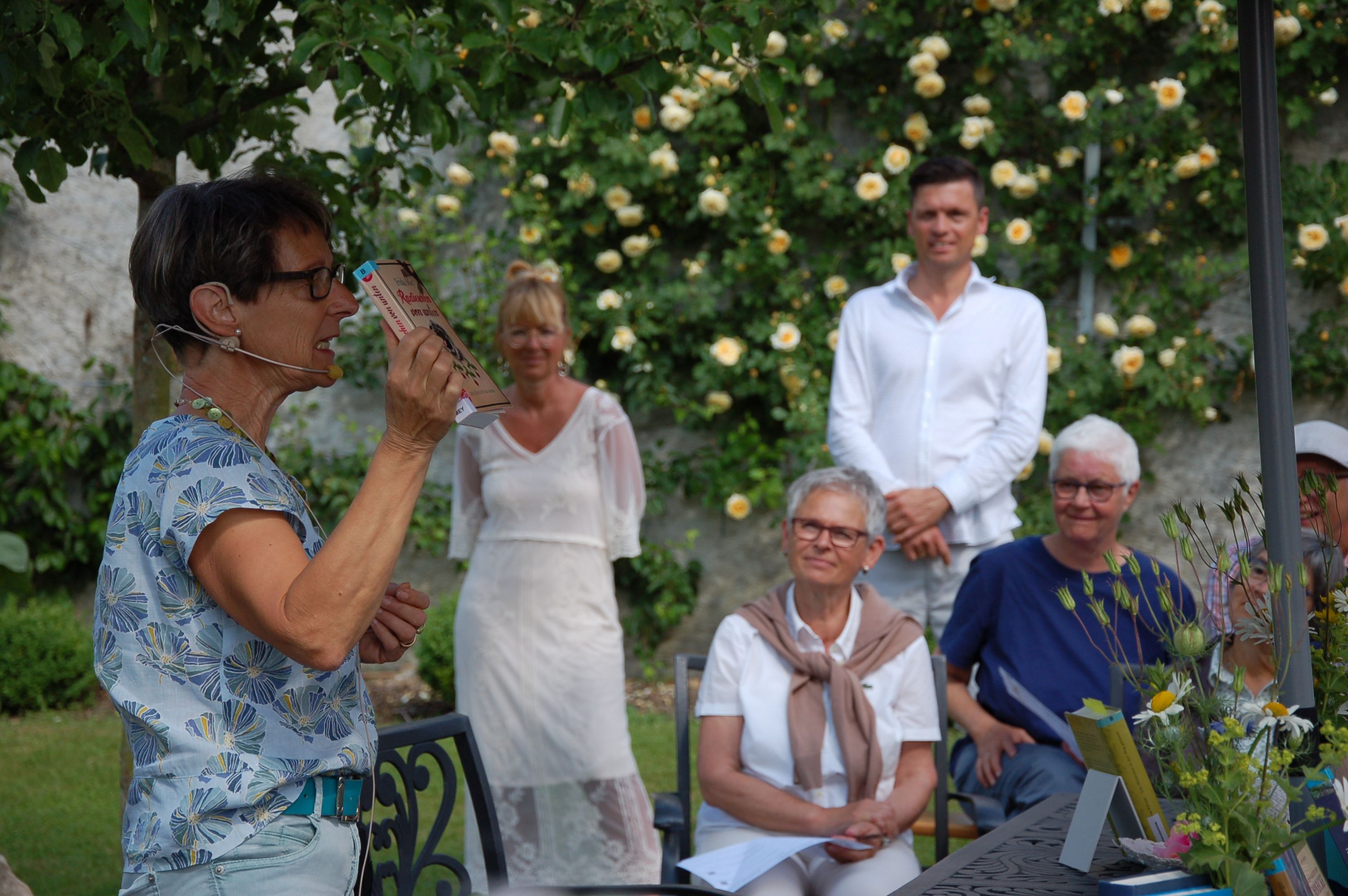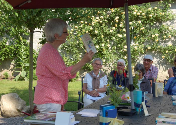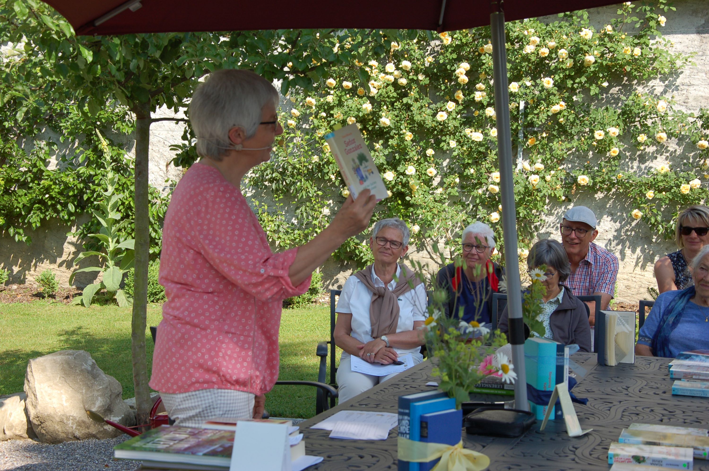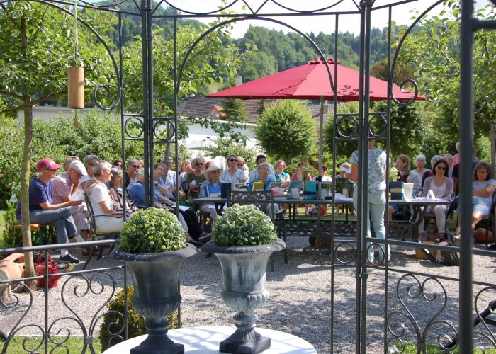 Die Bibliothek Ebnat-Kappel führte wie jedes Jahr ihr Büchercafé durch. Dies geschah am 2 .Juni an einem ganz speziellen Ort. Gemeinsam mit dem Gartenbauverein und der Familie Leitz lud die Bibliothek in den idyllischen Garten Steinfels ein. Bei herrlichstem Vorsommerwetter liessen sich zahlreiche Besucherinnen und Besucher auf Stühlen und Bänken auf dem Gartensitzplatz, den Bibliothekarinnen lauschend, in die Bücherwelt führen.