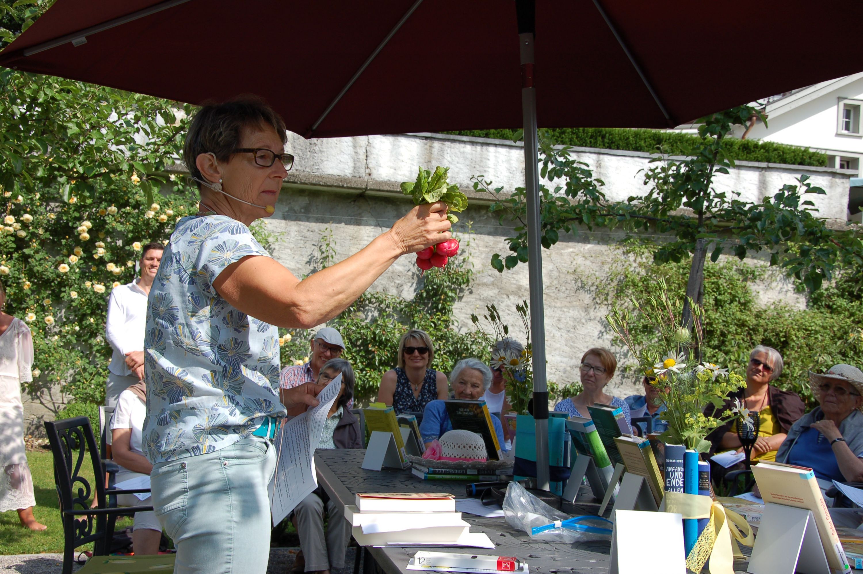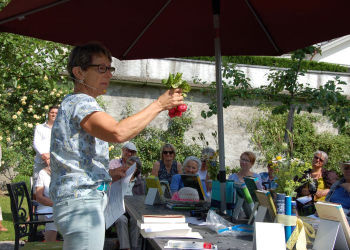 Die diesjährige Vorstellung einer Auswahl an Neuerscheinungen wurde passend unter das Motto "Garten" gestellt. Es wurden Krimis, Romane, Lebensberichte und Garten-Sachbücher vorgestellt. Wer war diesmal der Mörder? Der Gärtner? Was gehört auf einen Naschbalkon? Wer war Kräuterpfarrer Künzle? Wie gelangt man beim Gärtnern zu mehr Gelassenheit, Achtsam- und Genügsamkeit? Die vorgestellten Bücher konnten gleich ausgeliehen werden. Für vergnügliche Lesestunden mit interessanter Sommerlektüre im Liegestuhl, am Strand oder an andern lauschigen Plätzchen steht also nichts mehr im Wege.