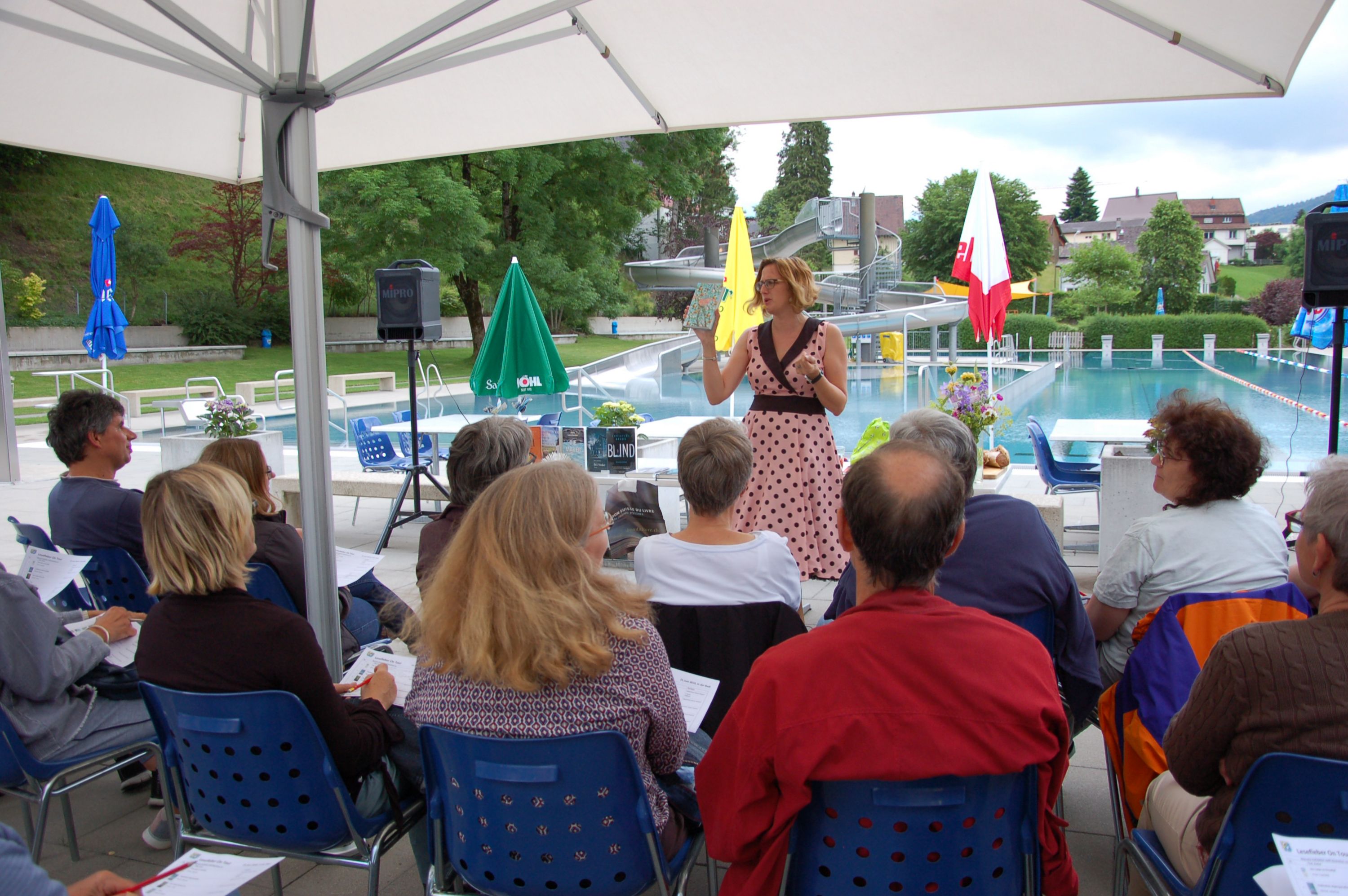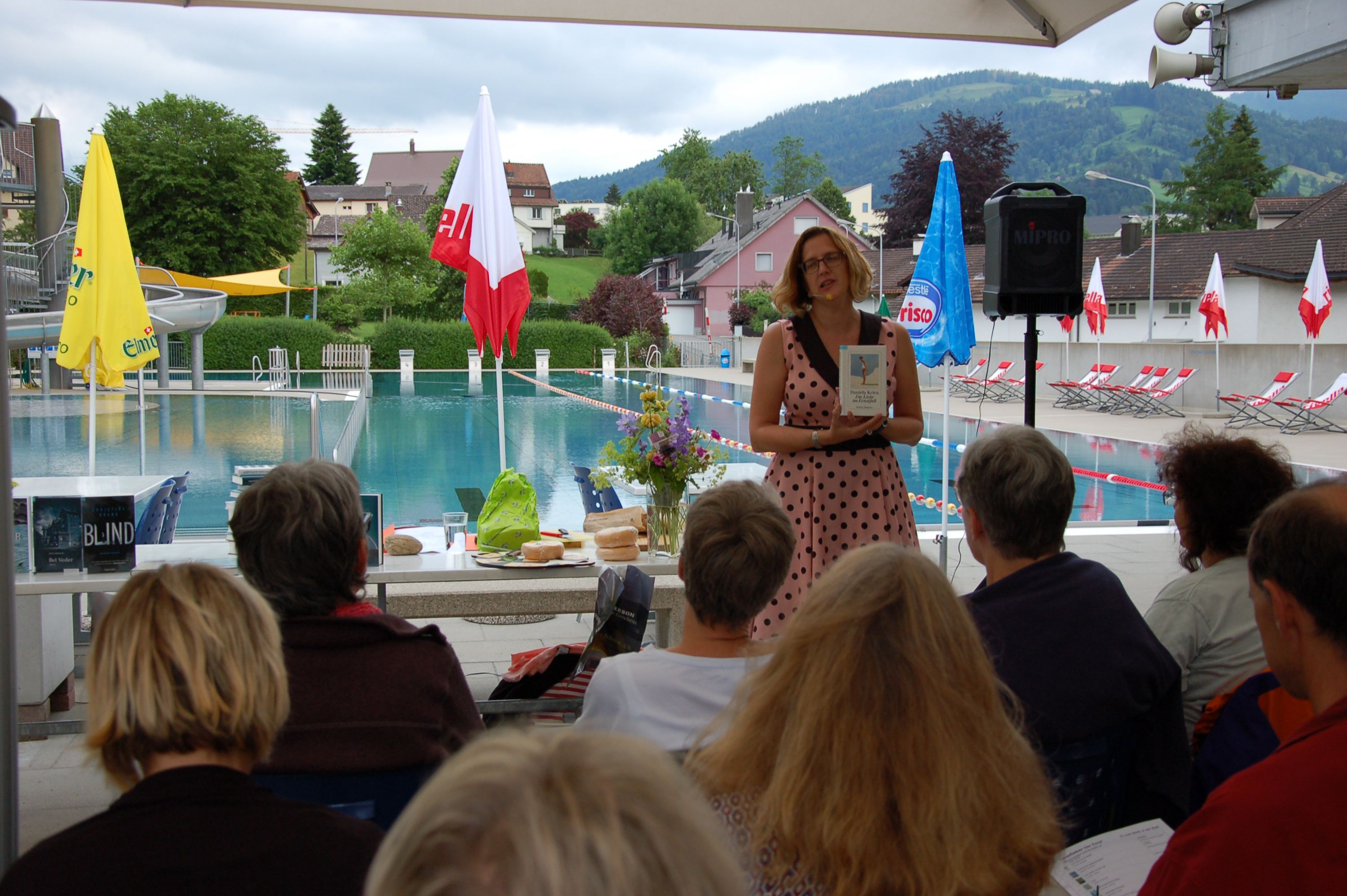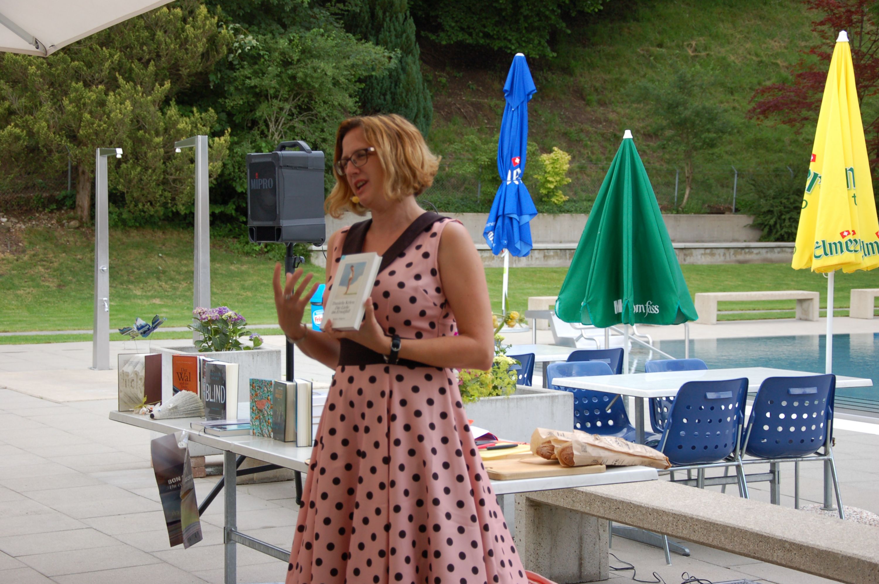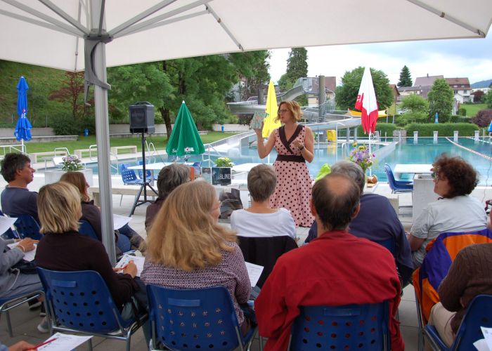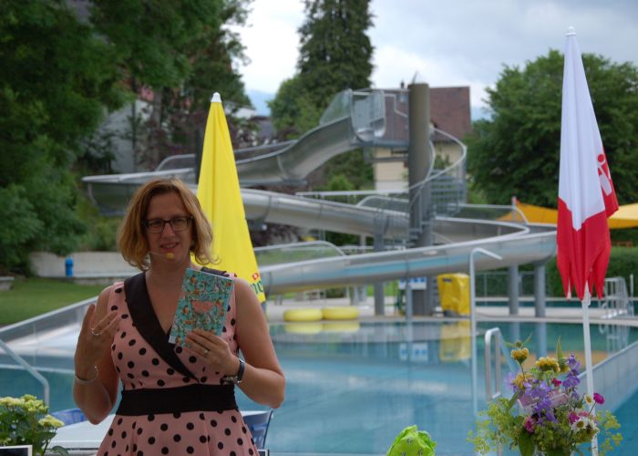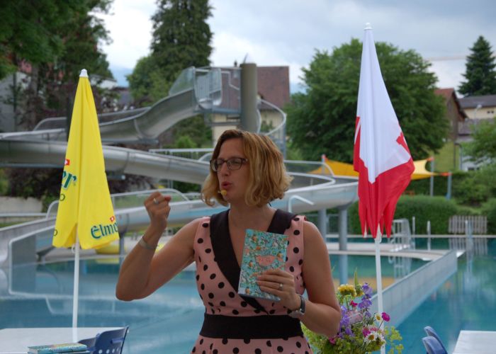 Am Freitagabend, 21.Juni luden die Bibliothek Ebnat-Kappel und das Schwimmbad zu einem ganz besonderen Anlass in die Badi ein. Mit einem Plätschern und Rauschen im Hintergrund erwartete ein zahlreiches Publikum die Literaturbloggerin Manuela Hofstätter, die in ihrem Gepäck ganz verschiedene Bücherneuheiten mitgebracht hatte. Auf Anhieb fesselte sie die Gäste auf ihre lebhafte, quirlige Art und begeisterte mit Romanen für jeden Geschmack. Sie zauberte während der Show einige Überraschungen fürs Publikum hervor und liess die Gäste von kulinarischen Leckerbissen kosten, um sie anschliessend mit Schweizer Bücherbons oder den mitgebrachten Büchern zu beschenken.
