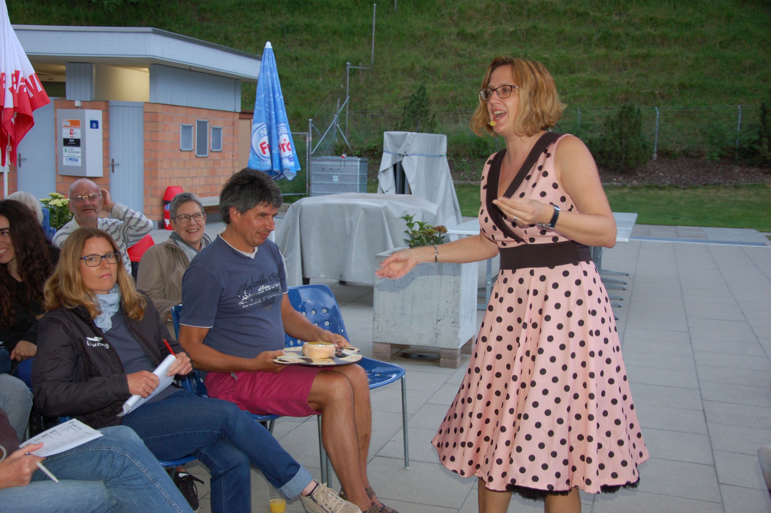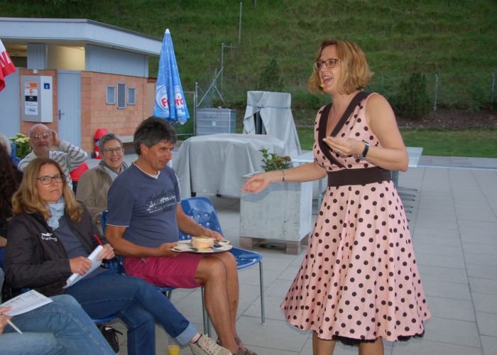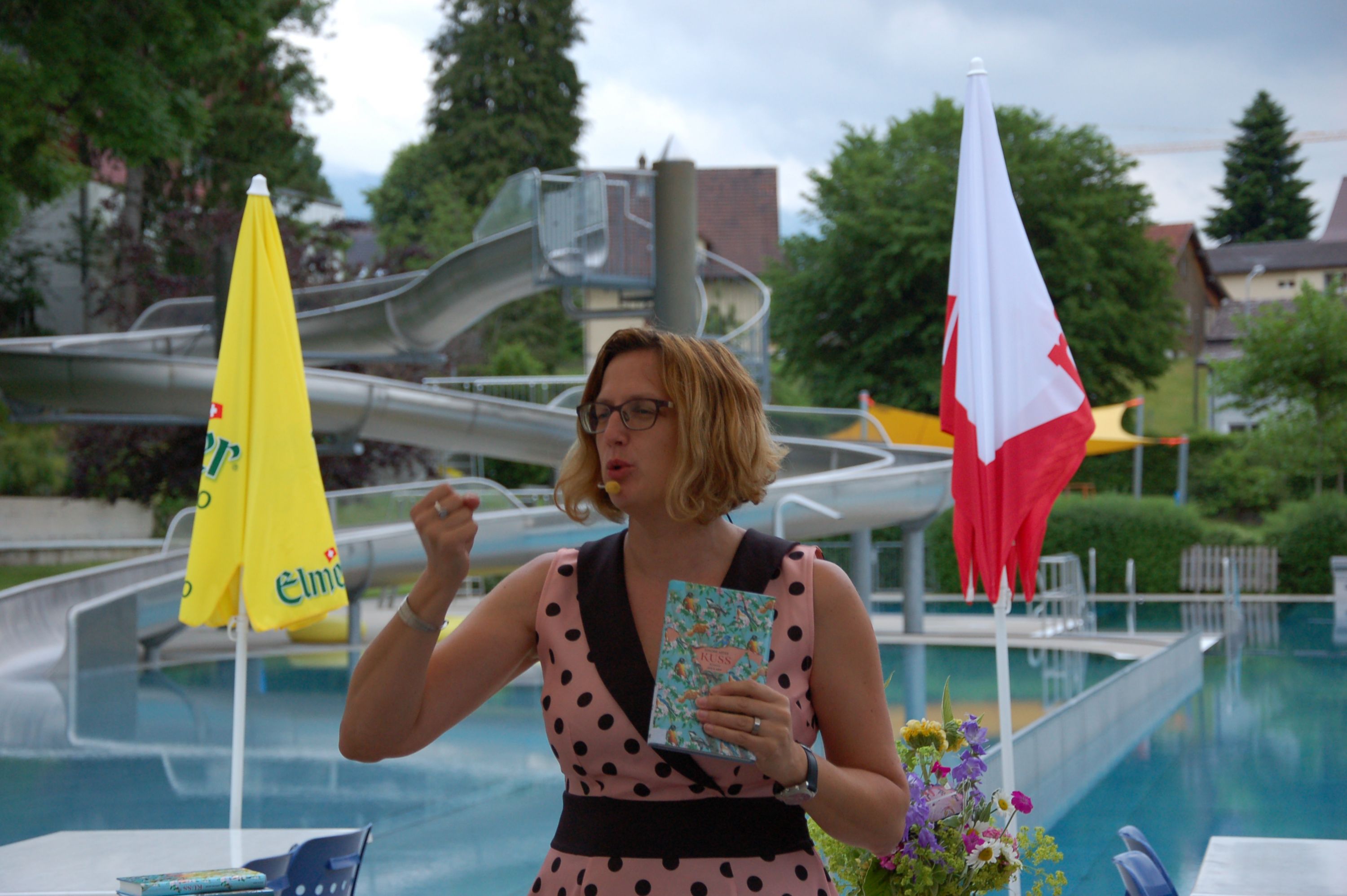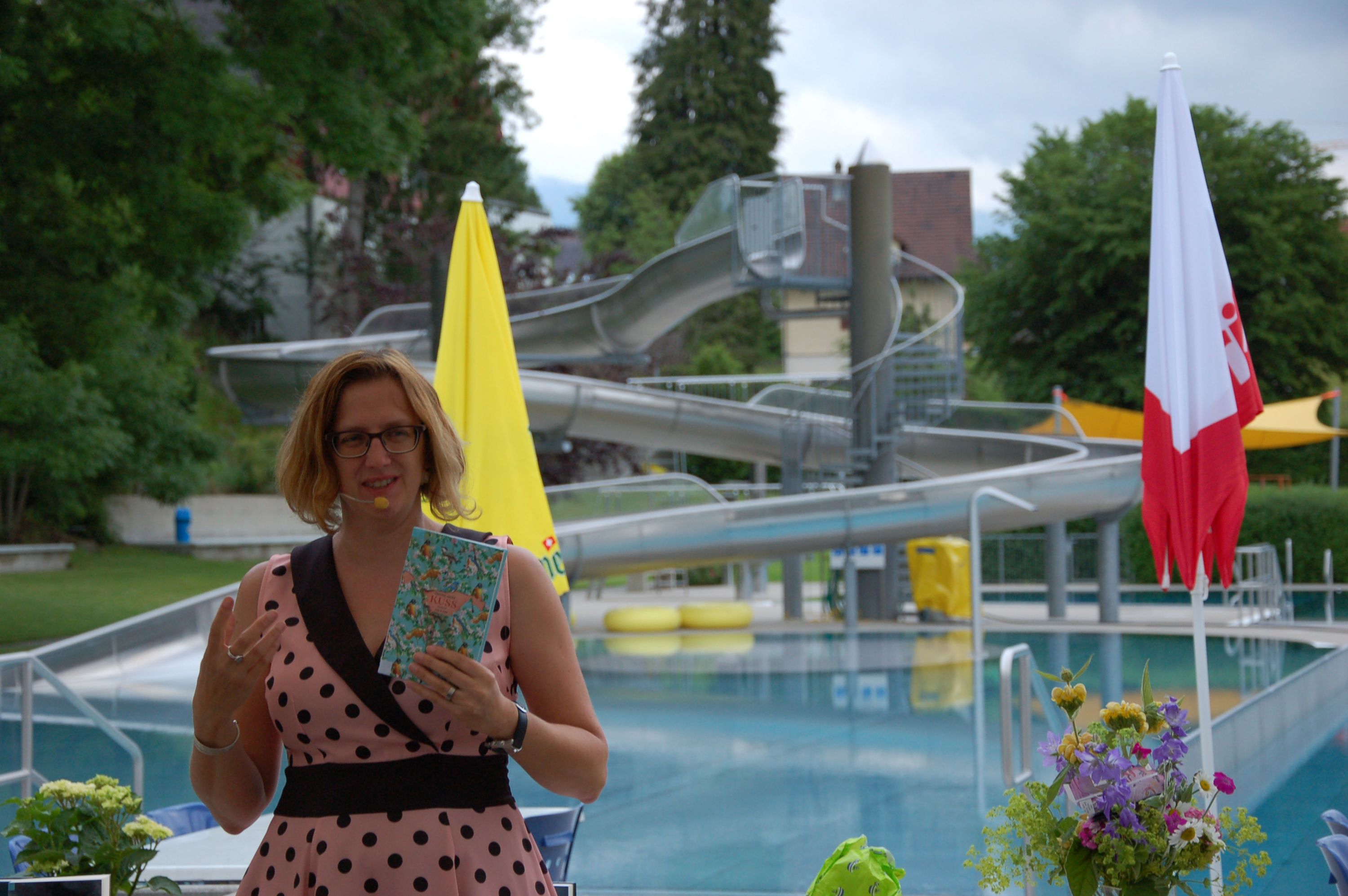 Am Freitagabend, 21.Juni luden die Bibliothek Ebnat-Kappel und das Schwimmbad zu einem ganz besonderen Anlass in die Badi ein. Mit einem Plätschern und Rauschen im Hintergrund erwartete ein zahlreiches Publikum die Literaturbloggerin Manuela Hofstätter, die in ihrem Gepäck ganz verschiedene Bücherneuheiten mitgebracht hatte. Auf Anhieb fesselte sie die Gäste auf ihre lebhafte, quirlige Art und begeisterte mit Romanen für jeden Geschmack. Sie zauberte während der Show einige Überraschungen fürs Publikum hervor und liess die Gäste von kulinarischen Leckerbissen kosten, um sie anschliessend mit Schweizer Bücherbons oder den mitgebrachten Büchern zu beschenken.