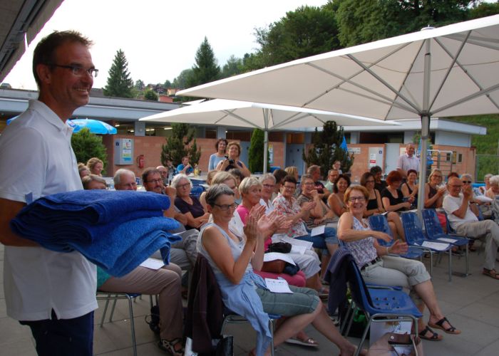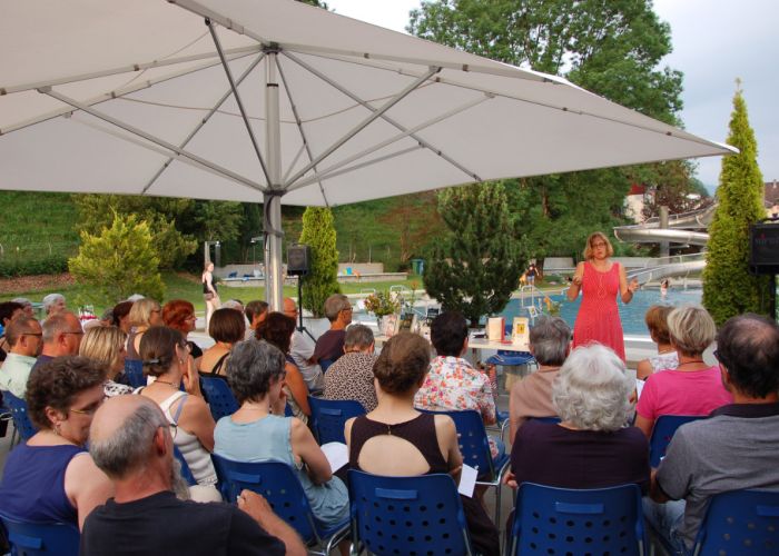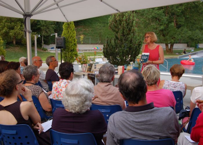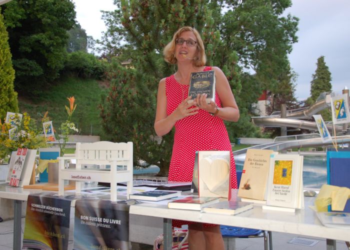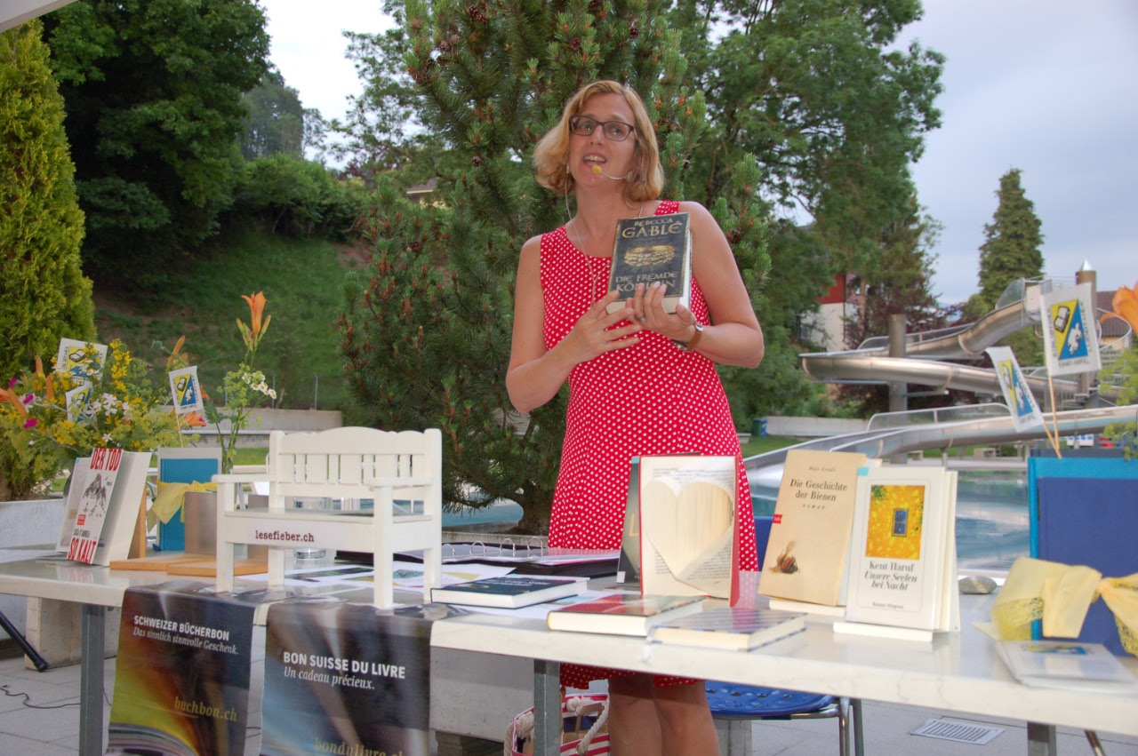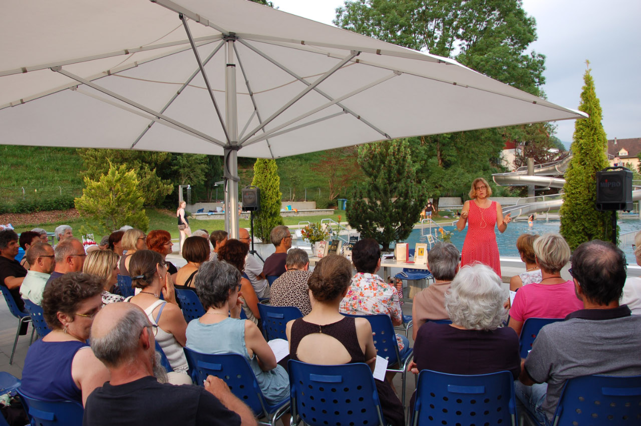 Am Freitagabend, 23.Juni luden die Bibliothek Ebnat-Kappel und das Schwimmbad zu einem ganz besonderen Anlass in die Badi ein. Mit einem Plätschern und Rauschen im Hintergrund erwartete ein zahlreiches Publikum die Literaturbloggerin Manuela Hofstätter, die in ihrem Gepäck ganz verschiedene Bücherneuheiten mitgebracht hatte. Auf Anhieb fesselte sie die Gäste auf ihre lebhafte, quirlige Art und begeisterte mit neuen Büchern für jeden Geschmack. Sie zauberte während der Show einige Überraschungen fürs Publikum hervor und liess sogar zwei mutige Frauen und einen Mann angekleidet nach einem Stein im Bassin tauchen, um sie dann mit Schweizer Bücherbons zu beschenken.