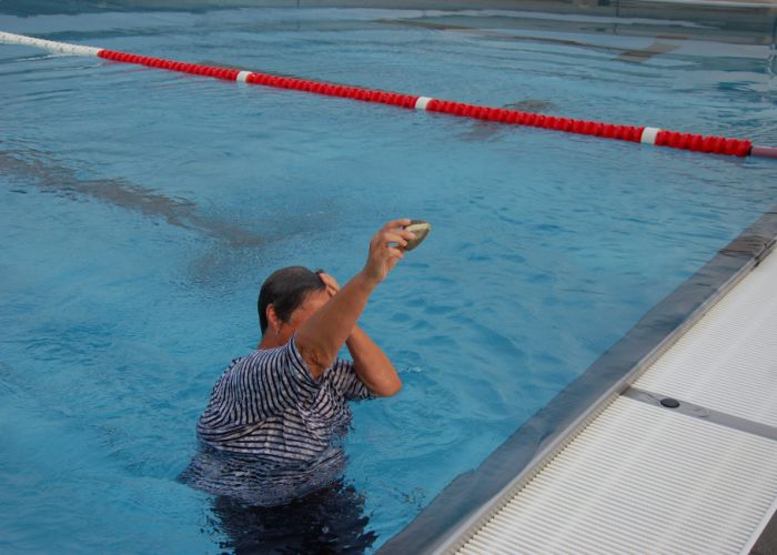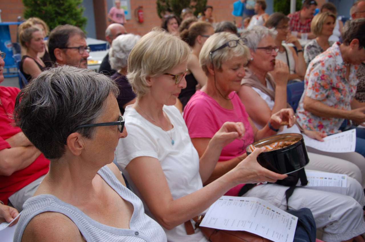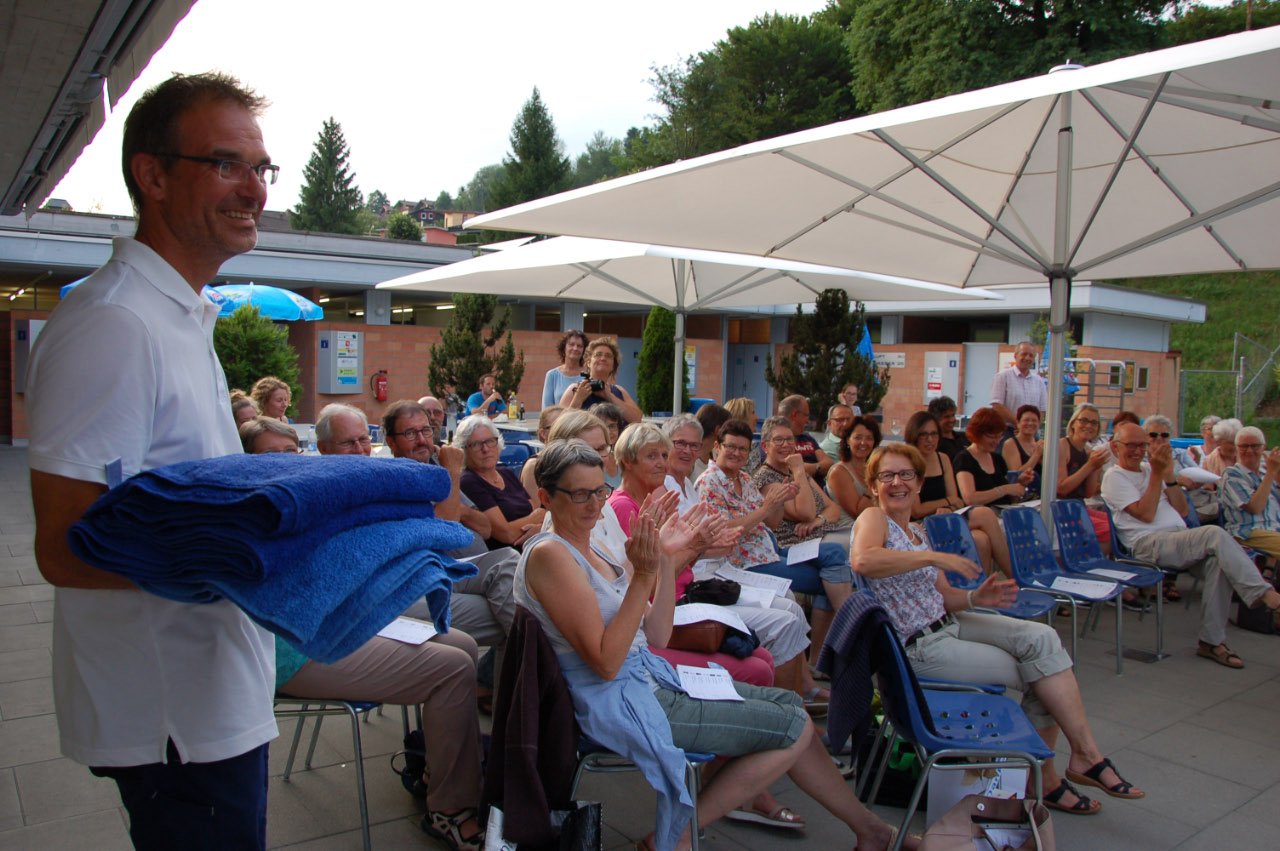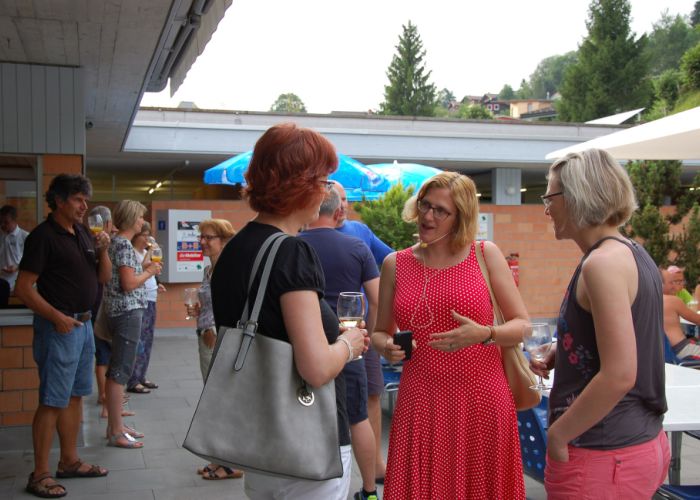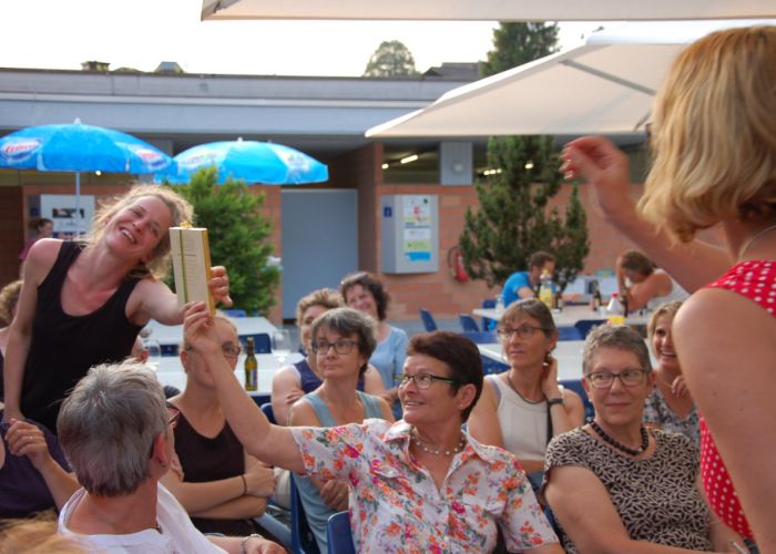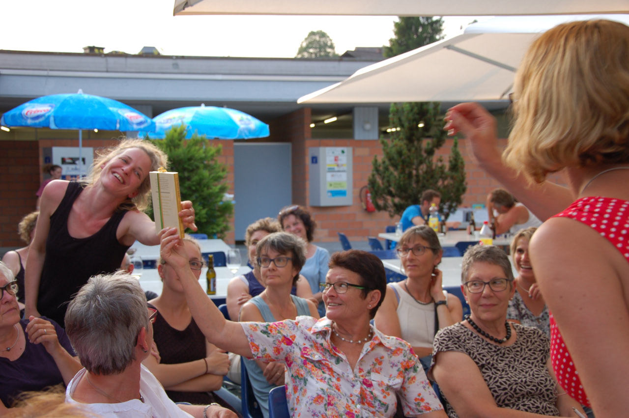 Am Freitagabend, 23.Juni luden die Bibliothek Ebnat-Kappel und das Schwimmbad zu einem ganz besonderen Anlass in die Badi ein. Mit einem Plätschern und Rauschen im Hintergrund erwartete ein zahlreiches Publikum die Literaturbloggerin Manuela Hofstätter, die in ihrem Gepäck ganz verschiedene Bücherneuheiten mitgebracht hatte. Auf Anhieb fesselte sie die Gäste auf ihre lebhafte, quirlige Art und begeisterte mit neuen Büchern für jeden Geschmack. Sie zauberte während der Show einige Überraschungen fürs Publikum hervor und liess sogar zwei mutige Frauen und einen Mann angekleidet nach einem Stein im Bassin tauchen, um sie dann mit Schweizer Bücherbons zu beschenken.